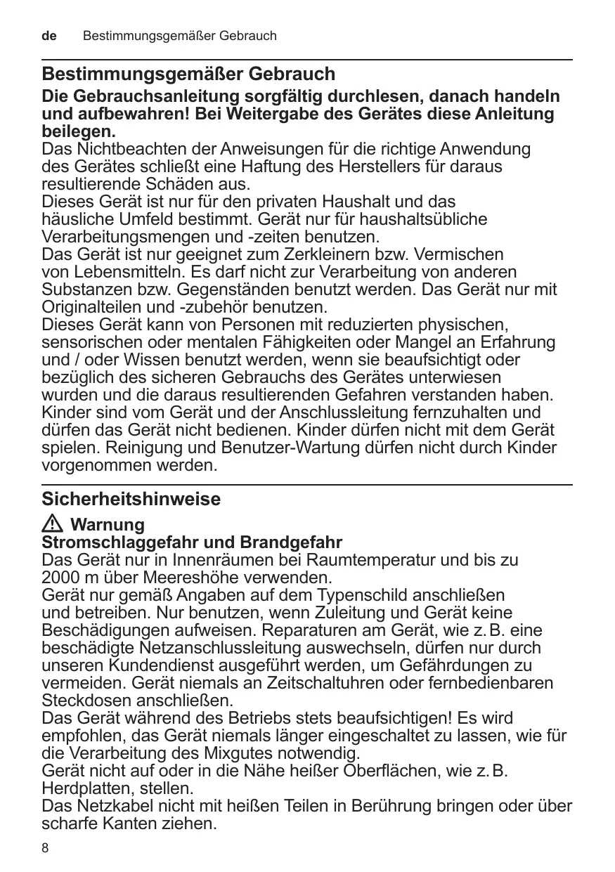 Die Gebrauchsanleitung sorgfältig durchlesen, danach handeln und aufbewahren! Bei Weitergabe des Gerätes diese Anleitung beilegen. Das Nichtbeachten der Anweisungen für die richtige Anwendung des Gerätes schließt eine Haftung des Herstellers für daraus resultierende Schäden aus. Dieses Gerät ist nur für den privaten Haushalt und das häusliche Umfeld bestimmt. Gerät nur für haushaltsübliche Verarbeitungsmengen und -zeiten benutzen. Das Gerät ist nur geeignet zum Zerkleinern bzw. Vermischen von Lebensmitteln. Es darf nicht zur Verarbeitung von anderen Substanzen bzw. Gegenständen benutzt werden. Das Gerät nur mit Originalteilen und -zubehör benutzen. Dieses Gerät kann von Personen mit reduzierten physischen, sensorischen oder mentalen Fähigkeiten oder Mangel an Erfahrung und / oder Wissen benutzt werden, wenn sie beaufsichtigt oder bezüglich des sicheren Gebrauchs des Gerätes unterwiesen wurden und die daraus resultierenden Gefahren verstanden haben. Kinder sind vom Gerät und der Anschlussleitung fernzuhalten und dürfen das Gerät nicht bedienen. Kinder dürfen nicht mit dem Gerät spielen. Reinigung und Benutzer-Wartung dürfen nicht durch Kinder vorgenommen werden.