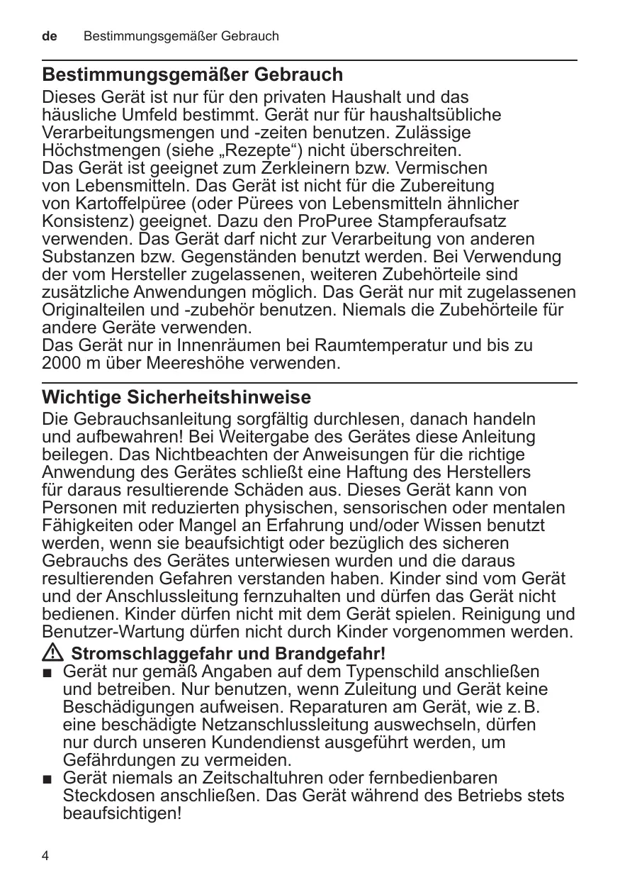 Dieses Gerät ist nur für den privaten Haushalt und das häusliche Umfeld bestimmt. Gerät nur für haushaltsübliche Verarbeitungsmengen und -zeiten benutzen. Zulässige Höchstmengen (siehe „Rezepte“) nicht überschreiten. Das Gerät ist geeignet zum Zerkleinern bzw. Vermischen von Lebensmitteln. Das Gerät ist nicht für die Zubereitung von Kartoffelpüree (oder Pürees von Lebensmitteln ähnlicher Konsistenz) geeignet. Dazu den ProPuree Stampferaufsatz verwenden. Das Gerät darf nicht zur Verarbeitung von anderen Substanzen bzw. Gegenständen benutzt werden. Bei Verwendung der vom Hersteller zugelassenen, weiteren Zubehörteile sind zusätzliche Anwendungen möglich. Das Gerät nur mit zugelassenen Originalteilen und -zubehör benutzen. Niemals die Zubehörteile für andere Geräte verwenden. Das Gerät nur in Innenräumen bei Raumtemperatur und bis zu 2000 m über Meereshöhe verwenden.