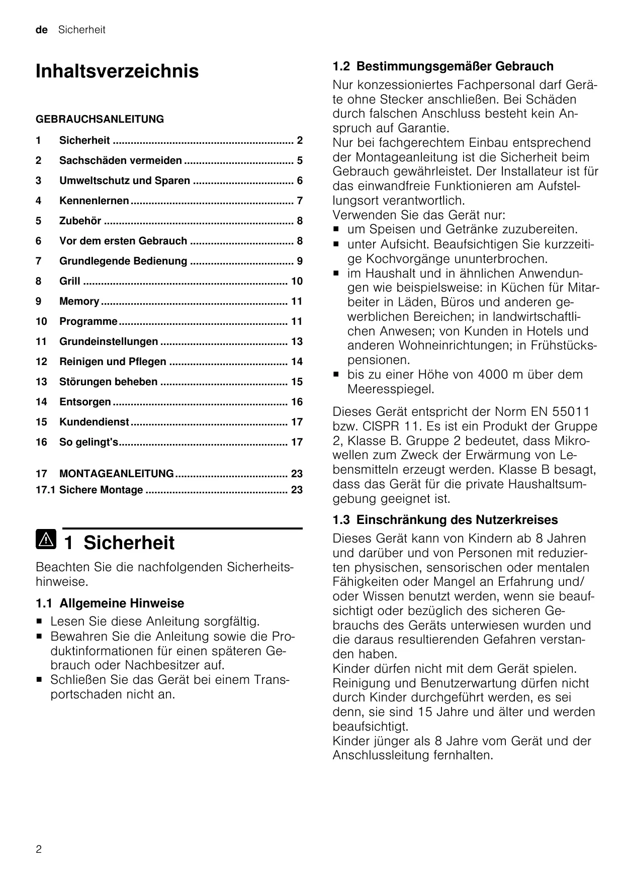 Nur konzessioniertes Fachpersonal darf Geräte ohne Stecker anschließen. Bei Schäden durch falschen Anschluss besteht kein Anspruch auf Garantie. Nur bei fachgerechtem Einbau entsprechend der Montageanleitung ist die Sicherheit beim Gebrauch gewährleistet. Der Installateur ist für das einwandfreie Funktionieren am Aufstellungsort verantwortlich. Verwenden Sie das Gerät nur: ¡ um Speisen und Getränke zuzubereiten. ¡ unter Aufsicht. Beaufsichtigen Sie kurzzeitige Kochvorgänge ununterbrochen. ¡ im Haushalt und in ähnlichen Anwendungen wie beispielsweise: in Küchen für Mitarbeiter in Läden, Büros und anderen gewerblichen Bereichen; in landwirtschaftlichen Anwesen; von Kunden in Hotels und anderen Wohneinrichtungen; in Frühstückspensionen. ¡ bis zu einer Höhe von 4000 m über dem Meeresspiegel. Dieses Gerät entspricht der Norm EN 55011 bzw. CISPR 11. Es ist ein Produkt der Gruppe 2, Klasse B. Gruppe 2 bedeutet, dass Mikrowellen zum Zweck der Erwärmung von Lebensmitteln erzeugt werden. Klasse B besagt, dass das Gerät für die private Haushaltsumgebung geeignet ist.