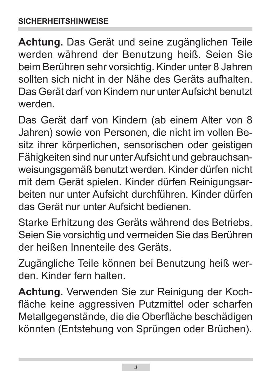 Achtung. Das Gerät und seine zugänglichen Teile werden während der Benutzung besteht. Seien Sie beim Berühren sehr vorsichtig. Kinder unter 8 Jahren sollenn sich nicht in der Nähe des Geräts aufhalten. Das Gerät darf von Kindern nur unter Aufsicht benutzt werden.
