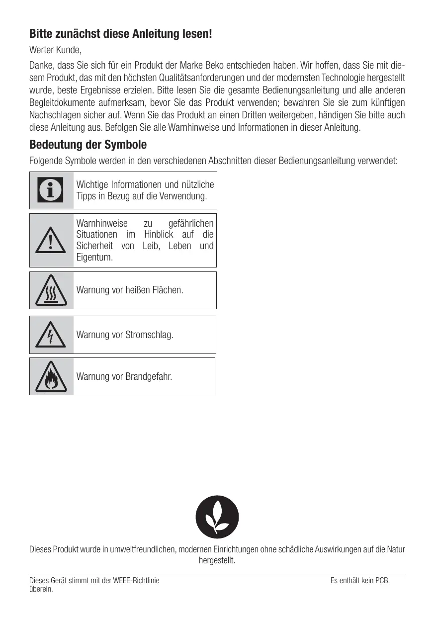 Bitte zunächst diese Anleitung lesen! Werter Kunde, Danke, dass Sie sich für ein Produkt der Marke Beko entschieden haben. Wir hoffen, dass Sie mit diesem Produkt, das mit den höchsten Qualitätsanforderungen und der modernsten Technologie hergestellt wurde, beste Ergebnisse erzielen. Bitte lesen Sie die gesamte Bedienungsanleitung und alle anderen Begleitdokumente aufmerksam, bevor Sie das Produkt verwenden; bewahren Sie sie zum künftigen Nachschlagen sicher auf. Wenn Sie das Produkt an einen Dritten weitergeben, händigen Sie bitte auch diese Anleitung aus. Befolgen Sie alle Warnhinweise und Informationen in dieser Anleitung.