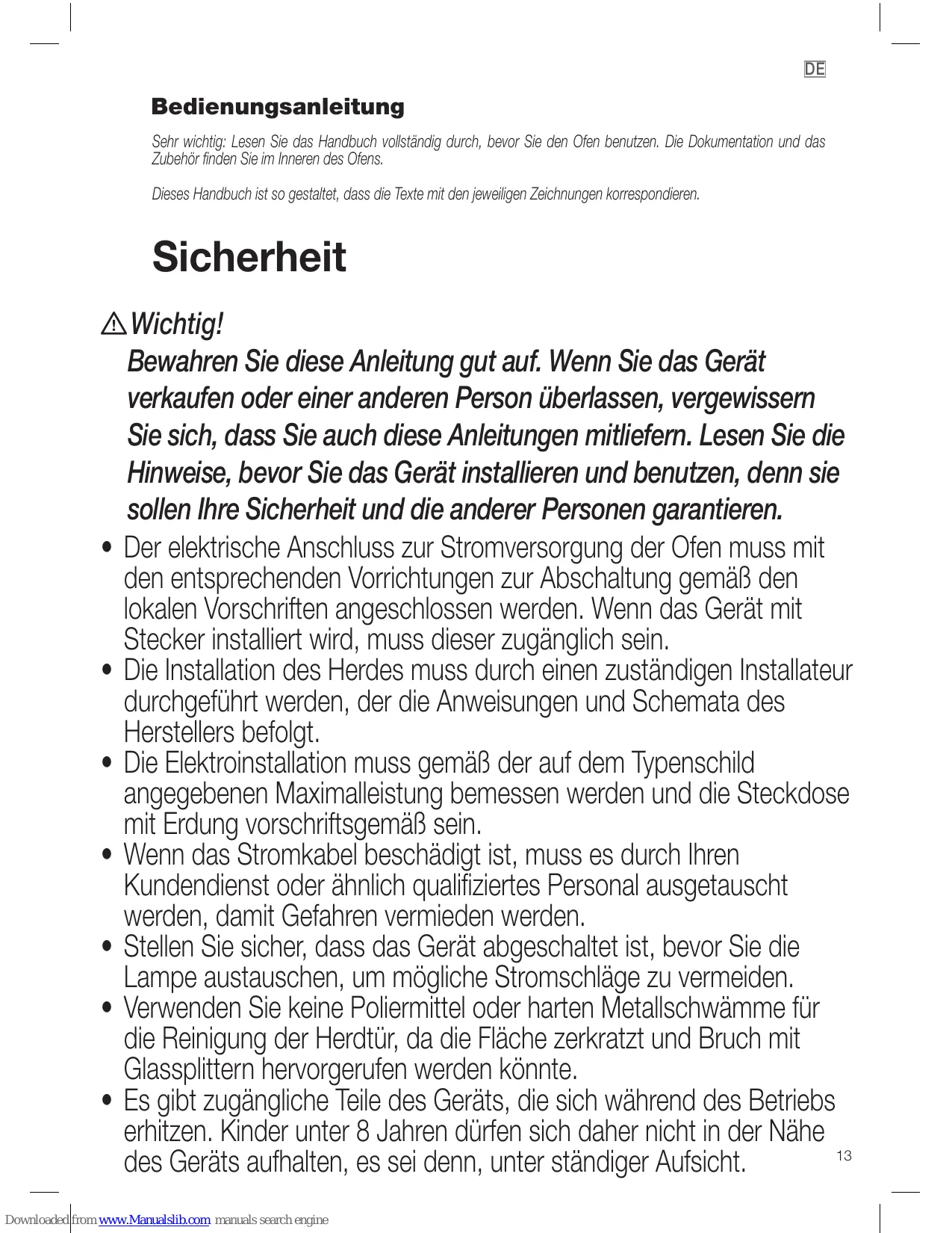 • Dieses Gerät kann von Kindern ab 8 Jahren und Personen verwendet mit verminderten physischen, sensoriellen oder geistigen Fähigkeiten oder mangelnder Erfahrung und Kenntnis benutzt werden, sofern sie eine angemessene Feststellung des Modells L’installation du four doit être confiée à un installateur agréé qui suivra les instructions et les schémas du fabricant. L’installation électrique doit être dimensionnée à la puissance maximale indiquée sur la plaque signalétique et la prise électrique équipée d’une mise à la terre réglementaire. Si le câble électrique est endommagé, il doit être remplacé par un technicien du service après-vente ou toute autre personne qualifiée afin d’éviter tout danger. S’assurer que l’appareil est débranché avant de remplacer la lampe pour éviter un éventuel choc électrique. Ne pas utiliser de produits de nettoyage abrasifs ou d’éponges métalliques dures pour nettoyer la porte du four, car vous risquer de la rayer et de provoquer la cassure en petits morceaux du verre. Pendant le fonctionnement de l’appareil, certaines parties accessibles peuvent devenir chaudes. Veiller à éloigner les enfants de moins de 8 19