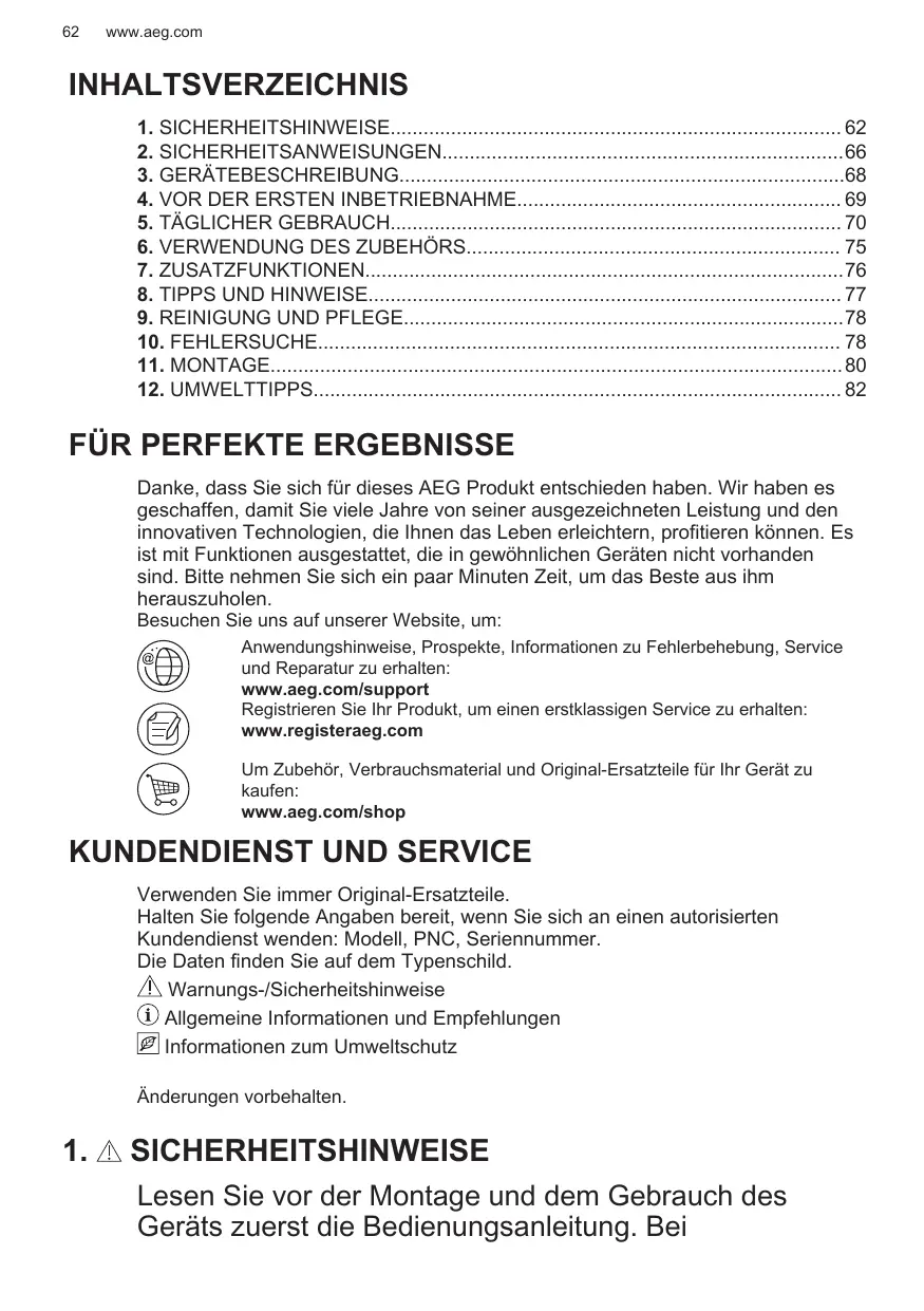 Danke, dass Sie sich für dieses AEG Produkt entschieden haben. Wir haben es geschaffen, damit Sie viele Jahre von seiner ausgezeichneten Leistung und den innovativen Technologien, die Ihnen das Leben erleichtern, profitieren können. Es ist mit Funktionen ausgestattet, die in gewöhnlichen Geräten nicht vorhanden sind. Bitte nehmen Sie sich ein paar Minuten Zeit, um das Beste aus ihm herauszuholen. Besuchen Sie uns auf unserer Website, um: Anwendungshinweise, Prospekte, Informationen zu Fehlerbehebung, Service und Reparatur zu erhalten: www.aeg.com/support Registrieren Sie Ihr Produkt, um einen erstklassigen Service zu erhalten: www.registeraeg.com Um Zubehör, Verbrauchsmaterial und Original-Ersatzteile für Ihr Gerät zu kaufen: www.aeg.com/shop