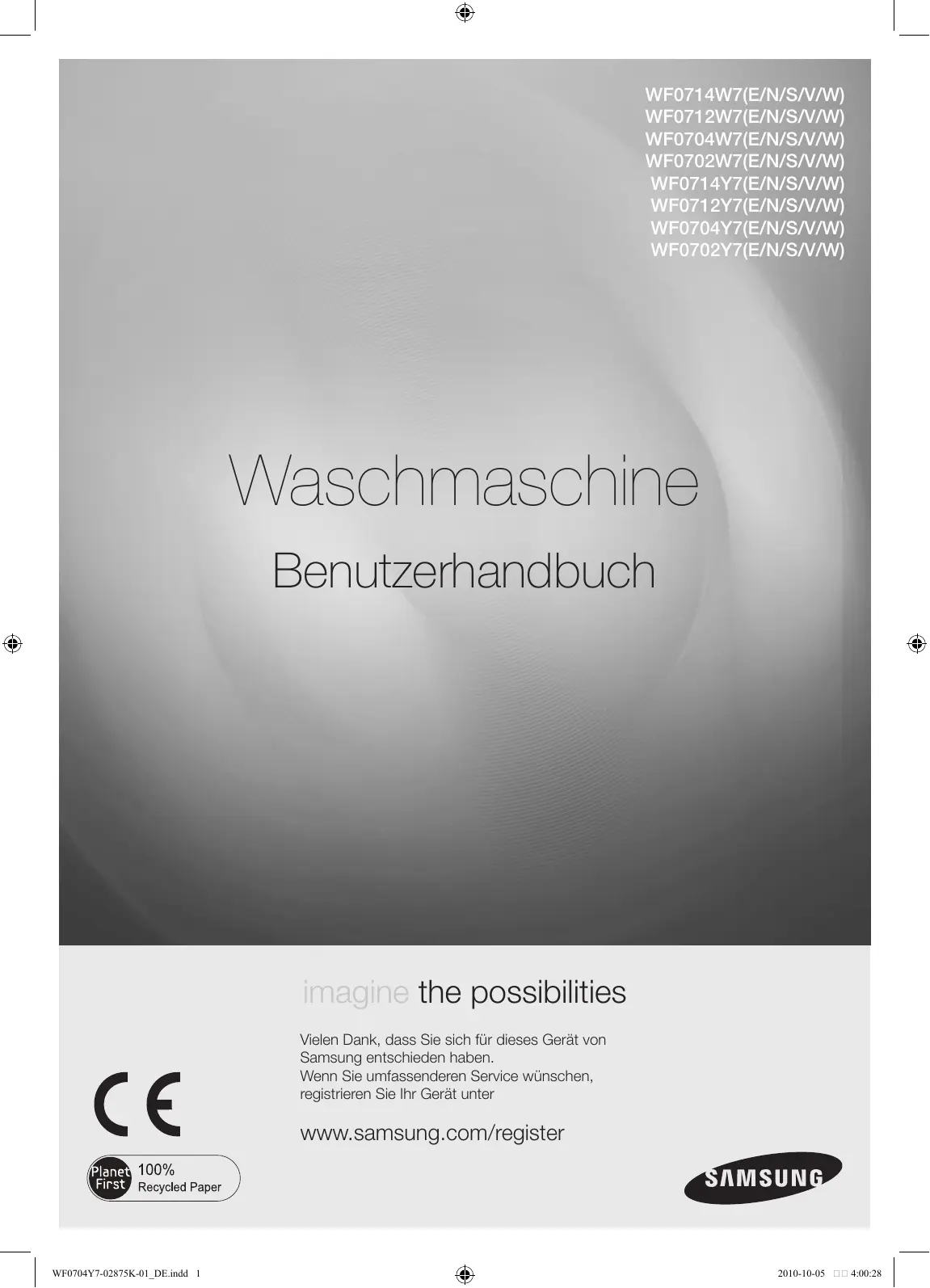 www.samsung.com N° code DC68-02875K-01_FR WF0704Y7-02875K-01_FR.indd 42 2010-10-05 4:00:04 WF0714W7(E/N/S/V/W) WF0712W7(E/N/S/V/W) WF0704W7(E/N/S/V/W) WF0702W7(E/N/S/V/W) WF0714Y7(E/N/S/V/W) WF0712Y7(E/N/S/V/W) WF0704Y7(E/N/S/V/W) WF0702Y7(E/N/S/V/W) Waschmaschine Benutzerhandbuch imagine the possibilities Vielen Dank, dass Sie sich für dieses Gerät von Samsung entschieden haben. Wenn Sie umfassenderen Service wünschen, registrieren Sie Ihr Gerät unter www.samsung.com/register WF0704Y7-02875K-01_DE.indd 1 2010-10-05 4:00:28 Features Ihrer neuen Waschmaschine von Samsung Mit diesen neuen Maschine macht Wäsche waschen richtig Spaß. Abgesehen von der speziellen Sprudlerfunkrion und der hohen Energieeffizienz verfügt Ihre neue Samsung-Waschmaschine über alle Vorteile, die das Waschen der Wäsche so einfach und angenehm wir nur möglich machen.
