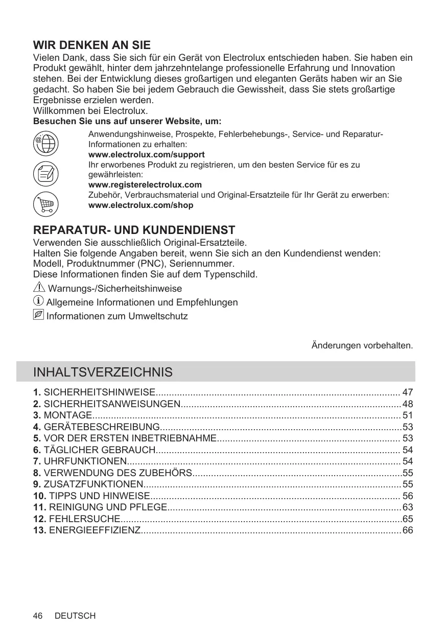 INHALTSVERZEICHNIS 1. SICHERHEITSHINWEISE 47 2. SICHERHEITSANWEISUNGEN 48 3. MONTAGE 51 4. GERÄTEBESCHREIBUNG53 5. VOR DER ERSTEN INBETRIEBNAHME 53 6. TÄGLICHER GEBRAUCH 54 7. UHRFUNKTIONEN 54 8. VERWENDUNG DES ZUBEHÖRS55 9. ZUSATZFUNKTIONEN 55 10. TIPPS UND HINWEISE 56 11. REINIGUNG UND PFLEGE 63 12. FEHLERSUCHE65 13. ENERGIEEFFIZIENZ 66
