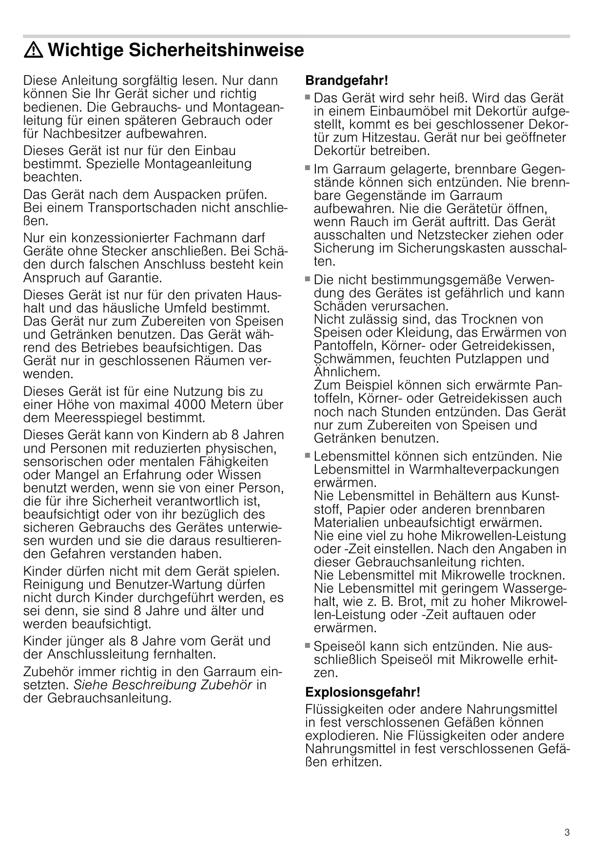 élevée. Ne jamais retirer le boîtier. Risque de brûlure ! ■ L'appareil devient très chaud. Ne jamais toucher les surfaces intérieures chaudes du compartiment de cuisson ni les résistances chauffantes. Toujours laisser l'appareil refroidir. Tenir les enfants éloignés. Cet appareil et ses parties accessibles deviennent chauds pendant leur utilisation. Il convient de veiller à ne pas toucher les éléments chauffants. Il convient de maintenir à distance les enfants de moins de 8 ans à moins qu’ils ne soient sous une surveillance continue. ■ Les récipients ou les accessoires deviennent très chaud. Toujours utiliser des maniques pour retirer le récipient ou les accessoires du compartiment de cuisson. ■ Les vapeurs d'alcool peuvent s'enflammer dans un compartiment de cuisson chaud. Ne jamais préparer de plats contenant de grandes quantités de boissons fortement alcoolisées. Utiliser uniquement de petites quantités de boissons fortement alcoolisées. Ouvrir la porte de l'appareil avec précaution. ■ Les aliments comportant une enveloppe ou une peau dure peuvent éclater, à la manière d'une explosion, au moment de les réchauffer, mais également après. Ne jamais faire cuire d'oeufs dans leur coquille ni réchauffer des oeufs durs. Ne jamais faire cuire d'animaux à coquilles ni de crustacés. Avant de faire des œufs sur le plat ou des œufs pochés, percer leur jaune.En cas d'utilisation d'aliments comportant une enveloppe ou une peau dure, comme des pommes, tomates, pommes de terre ou saucisses, l'enveloppe peut éclater. Percer l'enveloppe ou la peau avant de les réchauffer. ■ La chaleur ne se répartit pas uniformément dans l'alimentation pour bébé. Ne jamais réchauffer des aliments pour bébé dans des récipients fermés. Toujours retirer le couvercle et la tétine. Après réchauffage, remuer ou secouer énergiquement. Vérifier la température Risque de choc électrique !