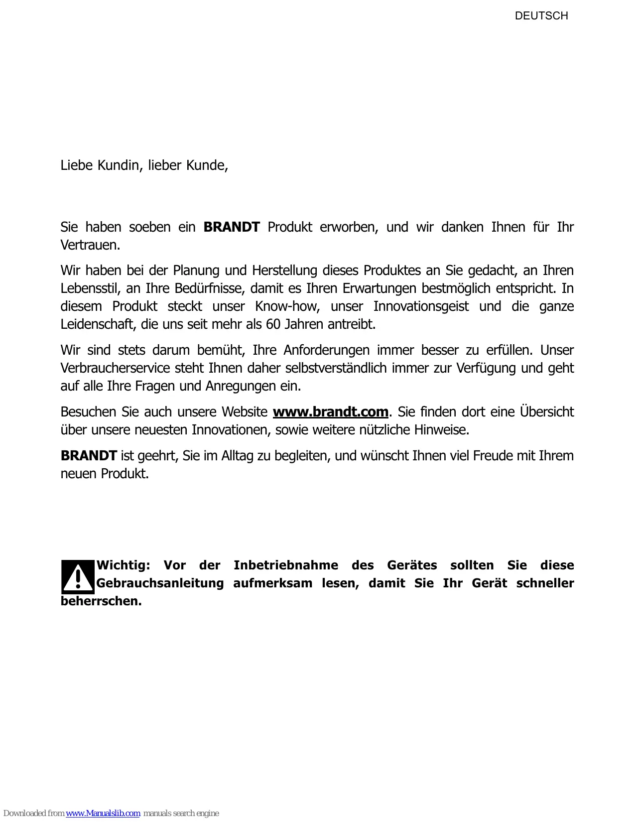 Dans un souci permanent de toujours mieux satisfaire vos exigences, notre service consommateurs est à votre disposition et à votre écoute pour répondre à toutes vos questions ou suggestions. Connectez-vous aussi sur notre site www.brandt.com où vous trouverez nos dernières innovations, ainsi que des informations utiles et complémentaires. BRANDT est heureux de vous accompagner au quotidien et vous souhaite de profiter pleinement de votre achat.