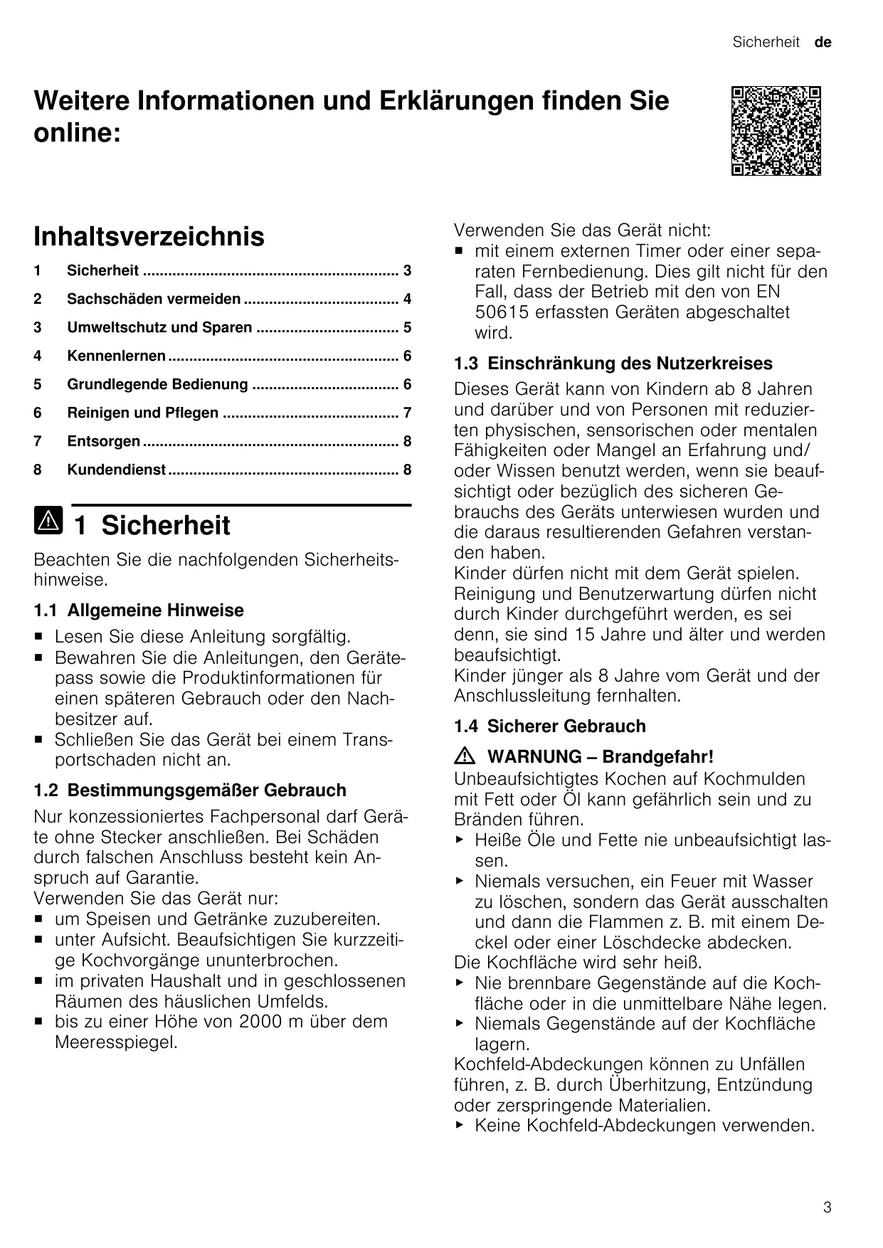 ¡ avec une minuterie externe ou une télécommande séparée. Ceci ne s'applique pas si le fonctionnement avec les appareils relevant de la norme EN 50615 est désactivé. 1.3 Restrictions du périmètre utilisateurs Les enfants de 8 ans et plus, les personnes souffrant d’un handicap physique, sensoriel ou mental ou ne détenant pas l’expérience et/ ou les connaissances nécessaires pourront utiliser cet appareil à condition de le faire sous surveillance, ou que son utilisation sûre leur ait été enseignée et qu’ils aient compris les dangers qui en émanent. Les enfants ne sont pas autorisés à jouer avec l'appareil. Les enfants ne doivent en aucun cas s’occuper du nettoyage et de la maintenance utilisateur, sauf s’ils sont âgés de 15 ans et plus et agissent sous surveillance. Les enfants de moins de 8 ans doivent être tenus à distance de l’appareil et du cordon d’alimentation secteur. 1.4 Utilisation sûre AVERTISSEMENT ‒ Risque d'incendie ! La cuisson non surveillée sur des plaques de cuisson avec de la graisse ou de l'huile peut être dangereuse et provoquer des incendies. ▶ Ne jamais laisser des huiles et graisses chaudes sans surveillance. ▶ Ne jamais essayer d'éteindre un feu avec de l'eau, mais éteignez l'appareil et couvrez ensuite les flammes, par exemple avec un couvercle ou une couverture anti-feu. La surface de cuisson devient très chaude. ▶ Ne jamais poser d'objets inflammables sur la surface de cuisson ou à proximité immédiate. ▶ Ne jamais conserver d'objets sur la surface de cuisson.