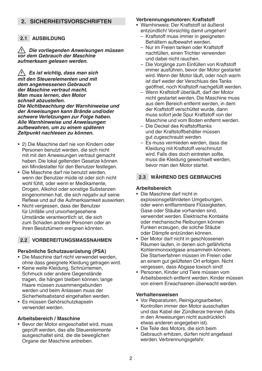 - Warnhinweis: Der Kraftstoff ist äußerst entzündlich! Vorsichtig damit umgehen! –– Kraftstoff muss immer in geeigneten Behältern aufbewahrt werden. –– Nur im Freien tanken oder Kraftstoff nachfüllen, einen Trichter verwenden und dabei nicht rauchen. –– Die Vorgänge zum Einfüllen von Kraftstoff immer ausführen, bevor der Motor gestartet wird. Wenn der Motor läuft, oder noch warm ist darf weder der Verschluss des Tanks geöffnet, noch Kraftstoff nachgefüllt werden. –– Wenn Kraftstoff überläuft, darf der Motor nicht gestartet werden. Die Maschine muss aus dem Bereich entfernt werden, in dem der Kraftstoff verschüttet wurde, dann muss sofort jede Spur Kraftstoff von der Maschine und vom Boden entfernt werden. –– Die Deckel des Kraftstofftanks und der Kraftstoffbehälter müssen gut zugeschraubt werden. –– Es muss vermieden werden, dass die Kleidung mit Kraftstoff verschmutzt wird. Falls dies doch eintreten sollte, muss die Kleidung gewechselt werden, bevor man den Motor startet.