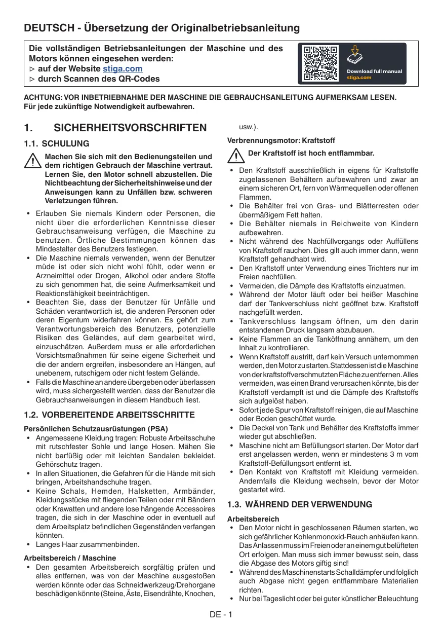- An einem für Kinder nicht zugänglichen Ort. DE - 5 ENGLISH - Translation of the original instructions All comprehensive machine and engine instruction manuals are available: ▷ on the website stiga.com ▷ by scanning the QR code Download full manual stiga.com