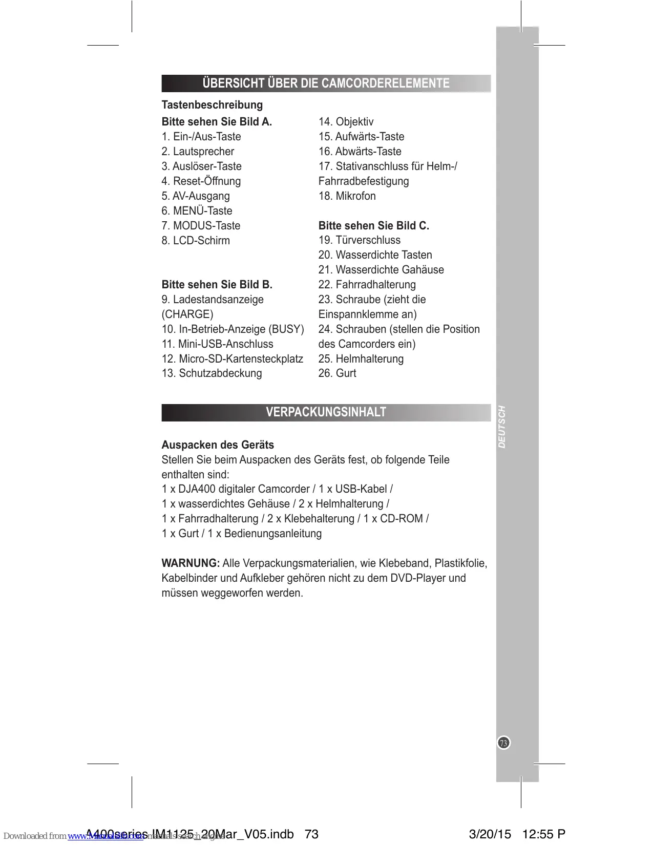 Lors du déballage, assurez-vous que les pièces suivantes soient incluses : 1 x Caméra numérique DJA400 / 1 x Câble USB / 1 x Boîtier étanche / 2 x Support de casque / 1 x Support de vélo / 2x Fixation adhésive / 1 x CD-ROM / 1 x Dragonne / 1 x Notice d’utilisation AVERTISSEMENT : Tous les matériaux d’emballage, comme le scotch, les feuilles en plastique, les ficelles et les étiquettes ne font pas partie du produit et doivent être jetés.