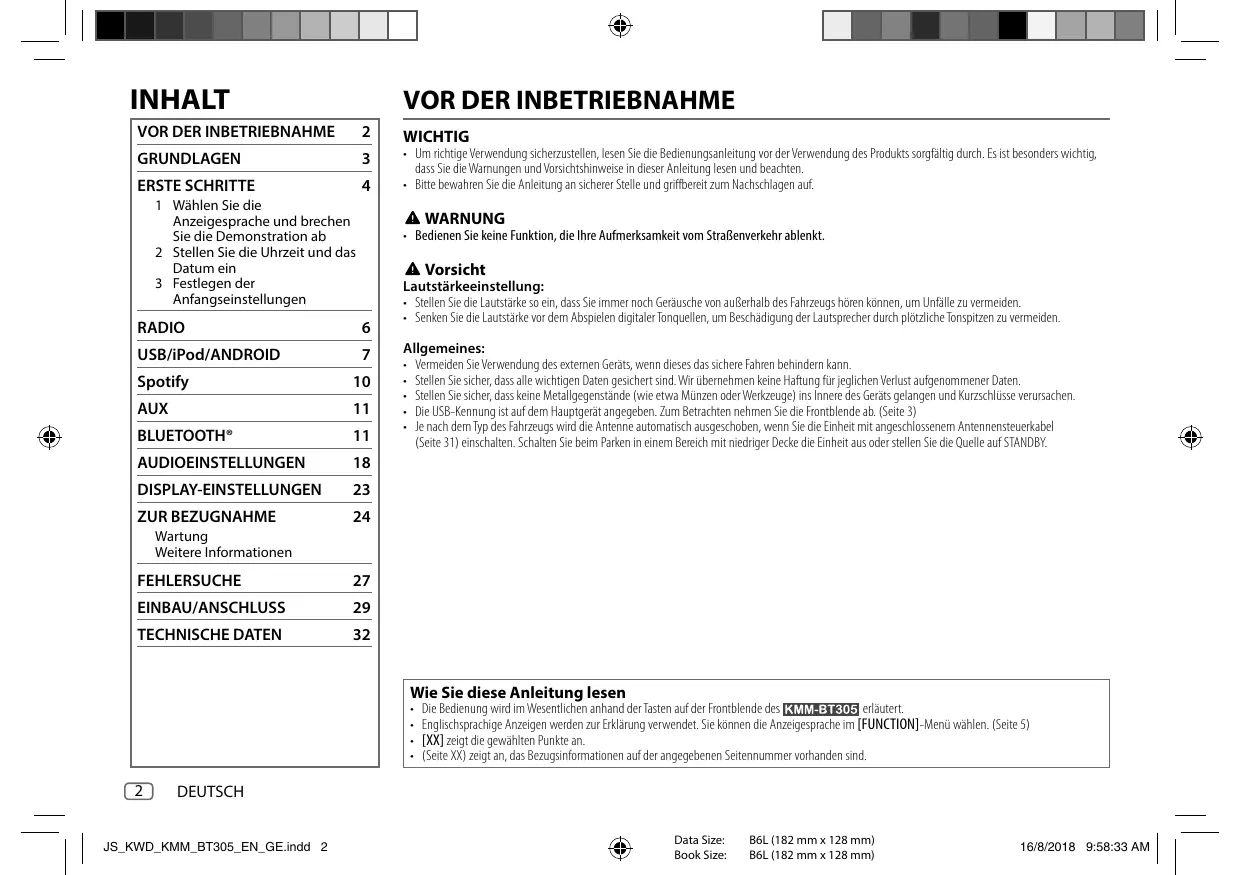 • Der Ausgangstonpegel kann sehr hoch oder niedrig sein. DEUTSCH JS_KWD_KMM_BT305_EN_GE.indd 5 Data Size: Book Size: B6L (182 mm x 128 mm) B6L (182 mm x 128 mm)
