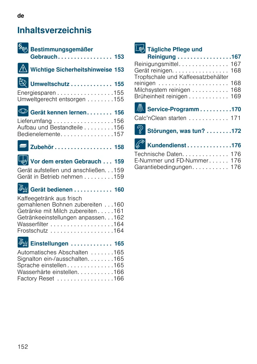 Reinigung . . . . . . . . . . . . . . . . .167 Reinigungsmittel. . . . . . . . . . . . . . . 167 Gerät reinigen. . . . . . . . . . . . . . . . . 168 Tropfschale und Kaffeesatzbehälter reinigen . . . . . . . . . . . . . . . . . . . . . 168 Milchsystem reinigen . . . . . . . . . . . 168 Brüheinheit reinigen . . . . . . . . . . . . 169