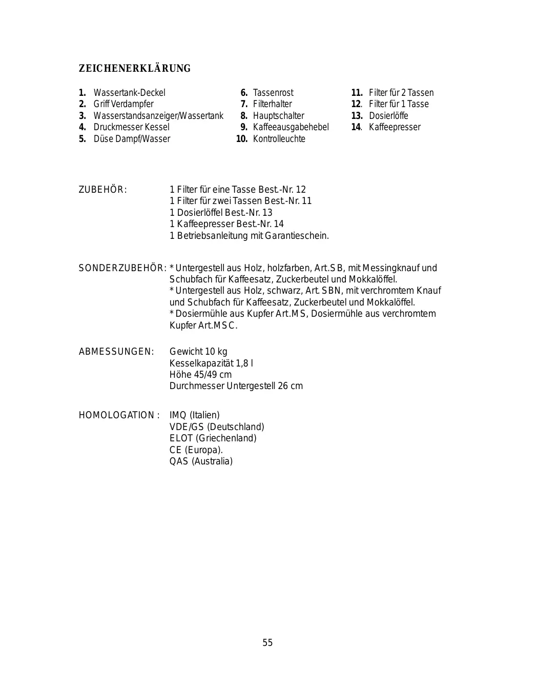 Dosierlöffel Kaffeepresser Kontrolleuchte Dampf Wärmefach Tassen 1 Filter für eine Tasse Best.-Nr. 12 1 Filter für zwei Tassen Best.-Nr. 11 1 Dosierlöffel Best.-Nr. 13 1 Kaffeepresser Best.-Nr. 14 1 Betriebsanleitung mit Garantieschein. Untergestell aus Holz Art. SA, Art. SAN Farbe Schwarz SONDERZUBEHÖR: * Dosiermühle aus Kupfer Art. MS, Dosiermühle aus verchromtem Kupfer Art. MSC. ABMESSUNGEN: Gewicht 13.00 kg Tankkapazität 2 l Höhe 69 cm Durchmesser Untergestell 26 cm HOMOLOGATION : CE (Europa).