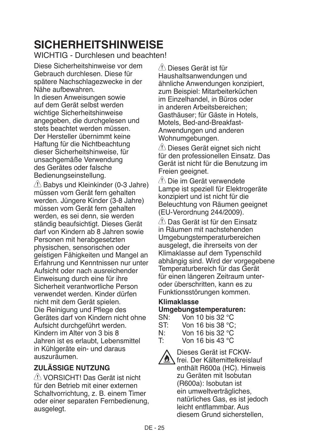 Von 16 bis 43 °C ZULÄSSIGE NUTZUNG VORSICHT! Das Gerät ist nicht für den Betrieb mit einer externen Schaltvorrichtung, z. B. einem Timer oder einer separaten Fernbedienung, ausgelegt. DE - 25