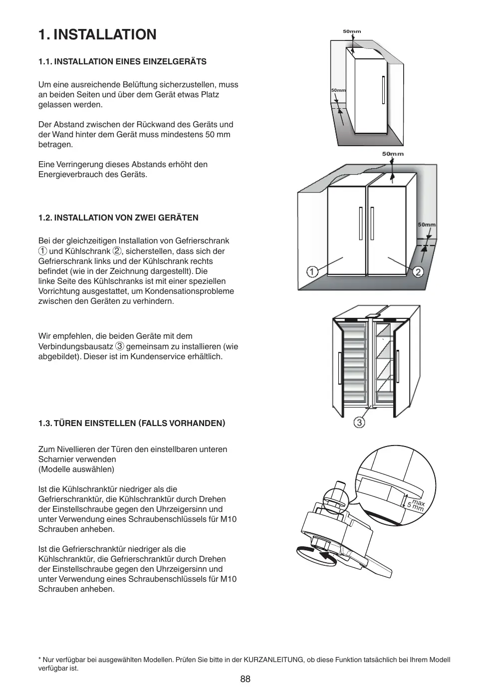 à gauche et le réfrigérateur à droite (comme indiqué dans le schéma). Sur le côté gauche du réfrigérateur se trouve un dispositif spécial permettant d'éviter les problèmes de condensation entre les appareils. Nous vous recommandons d'installer deux appareils ensemble à l'aide du kit de fixation 3 (comme illustré dans le schéma). Vous pouvez acquérir ce kit auprès du Service Après-Vente.
