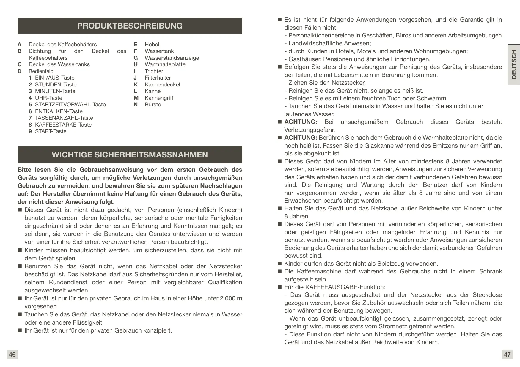 Ne tirez-pas sur le câble d'alimentation pour débrancher l'appareil. Ne placez jamais la verseuse dans un four à micro-ondes, sur une flamme ou sur une plaque de cuisson électrique. Ne versez pas d'eau dans l'appareil quand il est encore chaud. Tous les appareils sont soumis des procédures de contrôle qualité rigoureuses. Cela comprend des tests d'utilisation réels effectués sur des appareils sélectionnés aléatoirement, ce qui peut expliquer la présence éventuelle de traces d'utilisation. Fermez toujours le couvercle lorsque vous faites fonctionner la cafetière. Ne préparez pas de café si la verseuse en contient déjà. Pour éviter tout débordement, la verseuse doit être placée sur le socle chauffant de la cafetière, sinon un débordement d'eau chaude ou de café chaud pourrait se produire. La cafetière devient très chaude pendant le cycle d'infusion. Veuillez la manipuler avec précaution. Ne démontez pas l'appareil. N'utilisez pas la verseuse sans le couvercle. Ne versez pas d'eau chaude dans les réservoirs.