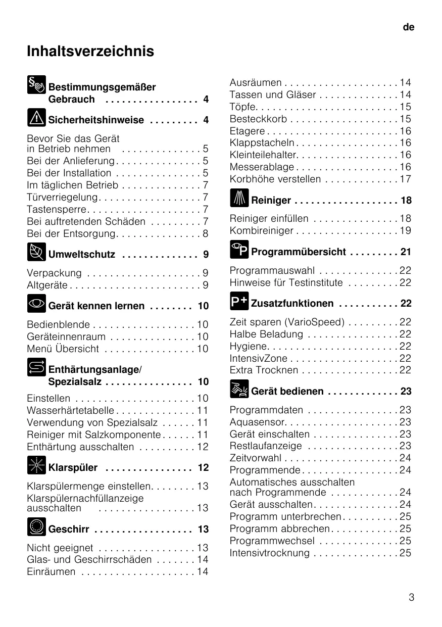 Bestimmungsgemäßer Gebrauch 2 Reinigen und warten . . . . . . . . Gesamtzustand der Maschine Spezialsalz und Klarspüler . . . Siebe . . . . . . . . . . . . . . . . . . . Sprüharme . . . . . . . . . . . . . . .