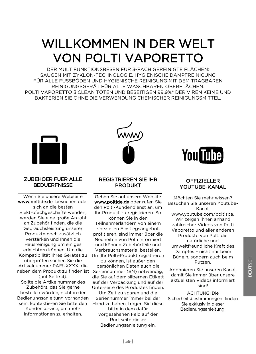 PRODUKT OFFIZIELLER YOUTUBE-KANAL Gehen Sie auf unsere Website Möchten Sie mehr wissen? www.poltide.de oder rufen Sie Besuchen Sie unseren Youtubeden Polti-Kundendienst an, um Kanal: Ihr Produkt zu registrieren. So www.youtube.com/poltispa. können Sie in den Wir zeigen Ihnen anhand Teilnehmerländern von einem zahlreicher Videos von Polti speziellen Einstiegsangebot Vaporetto und aller anderen profitieren, sind immer über die Produkte von Polti die Neuheiten von Polti informiert natürliche und und können Zubehörteile und umweltfreundliche Kraft des Verbrauchsmaterial bestellen. Dampfes – nicht nur beim Um Ihr Polti-Produkt registrieren Bügeln, sondern auch beim zu können, ist außer den Putzen. persönlichen Daten auch die Seriennummer (SN) notwendig, Abonnieren Sie unseren Kanal, damit Sie immer über unsere die Sie auf dem silbernen Etikett aktuellsten Videos informiert auf der Verpackung und auf der sind! Unterseite des Produktes finden. Um Zeit zu sparen und die ACHTUNG: Die Seriennummer immer bei der Sicherheitsbestimmungen finden Hand zu haben, tragen Sie diese Sie exklusiv in dieser bitte in dem dafür Bedienungsanleitung. vorgesehenen Feld auf der Rückseite dieser Bedienungsanleitung ein. | 59 | DEUTSCH