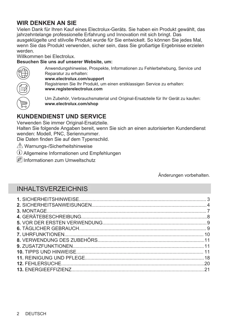 WIR DENKEN AN SIE Vielen Dank für Ihren Kauf eines Electrolux-Geräts. Sie haben ein Produkt gewählt, das jahrzehntelange professionelle Erfahrung und Innovation mit sich bringt. Das ausgeklügelte und stilvolle Produkt wurde für Sie entwickelt. So können Sie jedes Mal, wenn Sie das Produkt verwenden, sicher sein, dass Sie großartige Ergebnisse erzielen werden. Willkommen bei Electrolux. Besuchen Sie uns auf unserer Website, um: