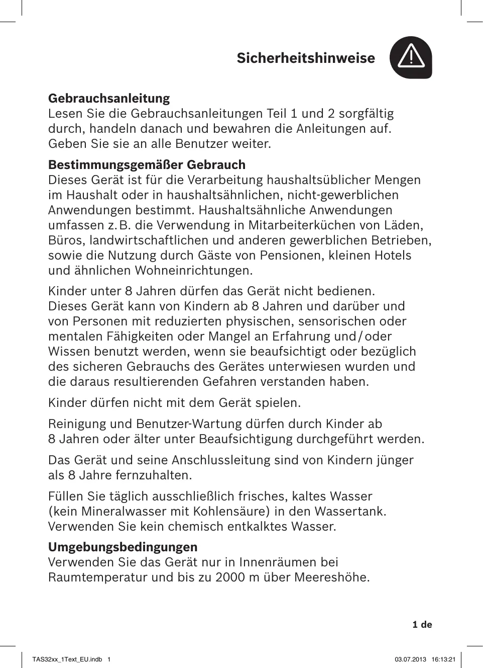 A Gebrauchsanleitung Lesen Sie die Gebrauchsanleitungen Teil 1 und 2 sorgfältig durch, handeln danach und bewahren die Anleitungen auf. Geben Sie sie an alle Benutzer weiter. Bestimmungsgemäßer Gebrauch Dieses Gerät ist für die Verarbeitung haushaltsüblicher Mengen im Haushalt oder in haushaltsähnlichen, nicht-gewerblichen Anwendungen bestimmt. Haushaltsähnliche Anwendungen umfassen z. B. die Verwendung in Mitarbeiterküchen von Läden, Büros, landwirtschaftlichen und anderen gewerblichen Betrieben, sowie die Nutzung durch Gäste von Pensionen, kleinen Hotels und ähnlichen Wohneinrichtungen. Kinder unter 8 Jahren dürfen das Gerät nicht bedienen. Dieses Gerät kann von Kindern ab 8 Jahren und darüber und von P ersonen mit reduzierten physischen, sensorischen oder mentalen Fähigkeiten oder Mangel an Erfahrung und / oder Wissen benutzt werden, wenn sie beaufsichtigt oder bezüglich des sicheren Gebrauchs des Gerätes unterwiesen wurden und die daraus resultierenden Gefahren verstanden haben. Kinder dürfen nicht mit dem Gerät spielen. Reinigung und Benutzer-Wartung dürfen durch Kinder ab 8 Jahren oder älter unter Beaufsichtigung durchgeführt werden. Das Gerät und seine Anschlussleitung sind von Kindern jünger als 8 Jahre fernzuhalten. Füllen Sie täglich ausschließlich frisches, kaltes Wasser (kein Mineralwasser mit Kohlensäure) in den Wassertank. Verwenden Sie kein chemisch entkalktes Wasser. Umgebungsbedingungen Verwenden Sie das Gerät nur in Innenräumen bei Raumtemperatur und bis zu 2000 m über Meereshöhe.