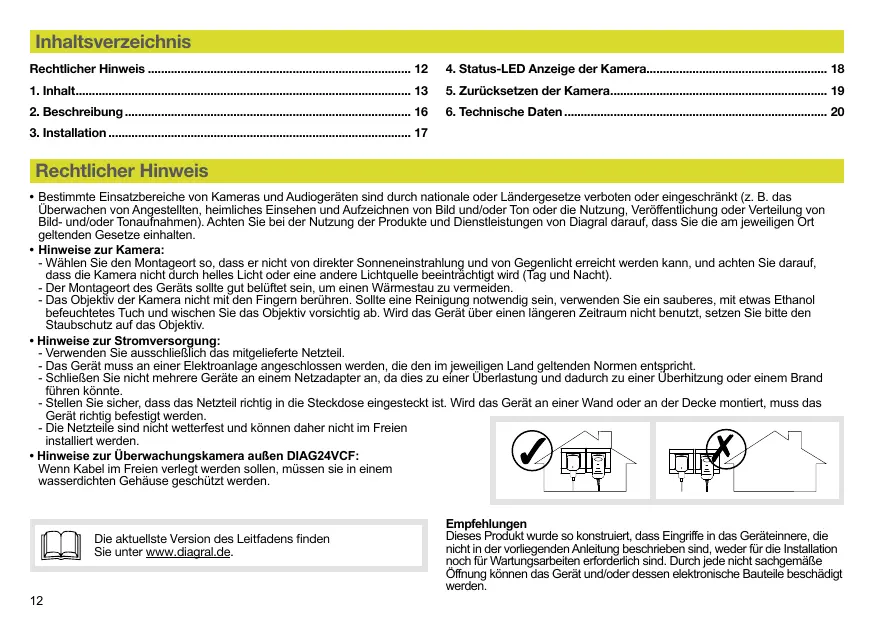 Rechtlicher Hinweis • Bestimmte Einsatzbereiche von Kameras und Audiogeräten sind durch nationale oder Ländergesetze verboten oder eingeschränkt (z. B. das Überwachen von Angestellten, heimliches Einsehen und Aufzeichnen von Bild und/oder Ton oder die Nutzung, Veröffentlichung oder Verteilung von Bild- und/oder Tonaufnahmen). Achten Sie bei der Nutzung der Produkte und Dienstleistungen von Diagral darauf, dass Sie die am jeweiligen Ort geltenden Gesetze einhalten. • Hinweise zur Kamera: - Wählen Sie den Montageort so, dass er nicht von direkter Sonneneinstrahlung und von Gegenlicht erreicht werden kann, und achten Sie darauf, dass die Kamera nicht durch helles Licht oder eine andere Lichtquelle beeinträchtigt wird (Tag und Nacht). - Der Montageort des Geräts sollte gut belüftet sein, um einen Wärmestau zu vermeiden. - Das Objektiv der Kamera nicht mit den Fingern berühren. Sollte eine Reinigung notwendig sein, verwenden Sie ein sauberes, mit etwas Ethanol befeuchtetes Tuch und wischen Sie das Objektiv vorsichtig ab. Wird das Gerät über einen längeren Zeitraum nicht benutzt, setzen Sie bitte den Staubschutz auf das Objektiv. • Hinweise zur Stromversorgung: - Verwenden Sie ausschließlich das mitgelieferte Netzteil. - Das Gerät muss an einer Elektroanlage angeschlossen werden, die den im jeweiligen Land geltenden Normen entspricht. - Schließen Sie nicht mehrere Geräte an einem Netzadapter an, da dies zu einer Überlastung und dadurch zu einer Überhitzung oder einem Brand führen könnte. - Stellen Sie sicher, dass das Netzteil richtig in die Steckdose eingesteckt ist. Wird das Gerät an einer Wand oder an der Decke montiert, muss das Gerät richtig befestigt werden. - Die Netzteile sind nicht wetterfest und können daher nicht im Freien installiert werden. • Hinweise zur Überwachungskamera außen DIAG24VCF: Wenn Kabel im Freien verlegt werden sollen, müssen sie in einem wasserdichten Gehäuse geschützt werden.