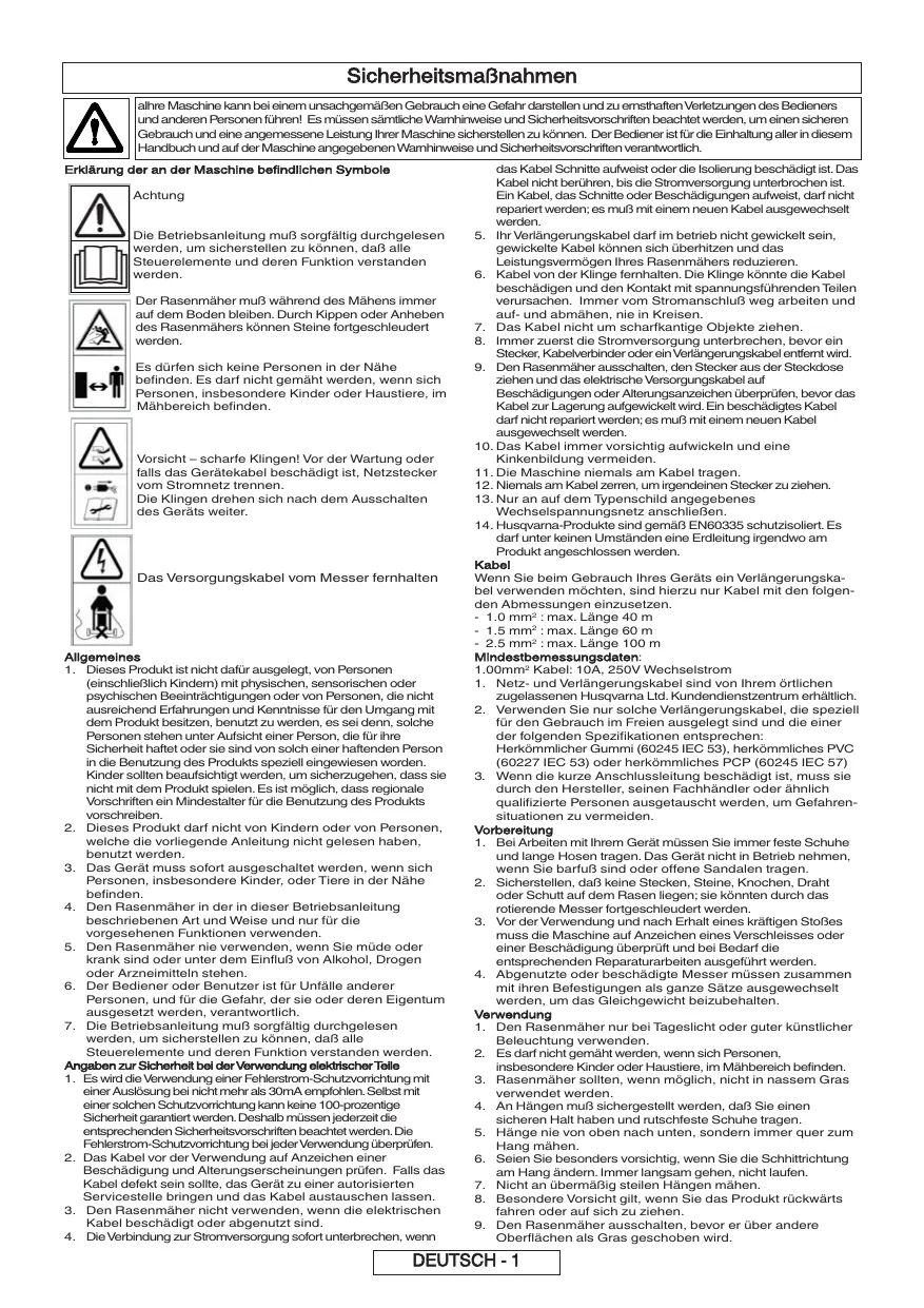 ENGLISH - 3 Sicherheitsmaßnahmen aIhre Maschine kann bei einem unsachgemäßen Gebrauch eine Gefahr darstellen und zu ernsthaften Verletzungen des Bedieners und anderen Personen führen! Es müssen sämtliche Warnhinweise und Sicherheitsvorschriften beachtet werden, um einen sicheren Gebrauch und eine angemessene Leistung Ihrer Maschine sicherstellen zu können. Der Bediener ist für die Einhaltung aller in diesem Handbuch und auf der Maschine angegebenen Warnhinweise und Sicherheitsvorschriften verantwortlich. Erklärung der an der Maschine befindlichen Symbole Achtung Die Betriebsanleitung muß sorgfältig durchgelesen werden, um sicherstellen zu können, daß alle Steuerelemente und deren Funktion verstanden werden. Der Rasenmäher muß während des Mähens immer auf dem Boden bleiben. Durch Kippen oder Anheben des Rasenmähers können Steine fortgeschleudert werden. Es dürfen sich keine Personen in der Nähe befinden. Es darf nicht gemäht werden, wenn sich Personen, insbesondere Kinder oder Haustiere, im Mähbereich befinden. Vorsicht – scharfe Klingen! Vor der Wartung oder falls das Gerätekabel beschädigt ist, Netzstecker vom Stromnetz trennen. Die Klingen drehen sich nach dem Ausschalten des Geräts weiter. Das Versorgungskabel vom Messer fernhalten Allgemeines