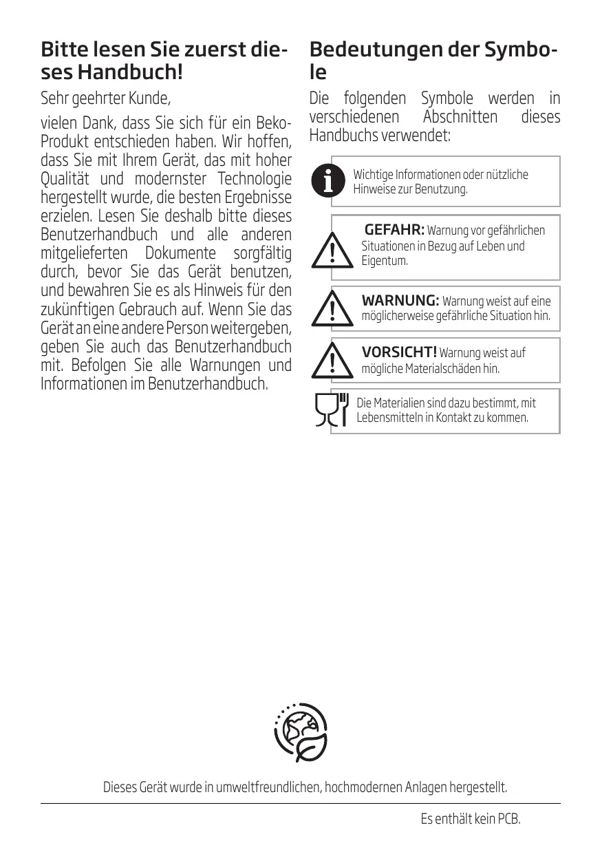 Sehr geehrter Kunde, Die folgenden Symbole werden in vielen Dank, dass Sie sich für ein Beko- verschiedenen Abschnitten dieses Produkt entschieden haben. Wir hoffen, Handbuchs verwendet: dass Sie mit Ihrem Gerät, das mit hoher Wichtige Informationen oder nützliche Qualität und modernster Technologie Hinweise zur Benutzung. hergestellt wurde, die besten Ergebnisse erzielen. Lesen Sie deshalb bitte dieses GEFAHR: Warnung vor gefährlichen Benutzerhandbuch und alle anderen Situationen in Bezug auf Leben und mitgelieferten Dokumente sorgfältig Eigentum. durch, bevor Sie das Gerät benutzen, und bewahren Sie es als Hinweis für den WARNUNG: Warnung weist auf eine zukünftigen Gebrauch auf. Wenn Sie das möglicherweise gefährliche Situation hin. Gerät an eine andere Person weitergeben, geben Sie auch das Benutzerhandbuch VORSICHT! Warnung weist auf mit. Befolgen Sie alle Warnungen und mögliche Materialschäden hin. Informationen im Benutzerhandbuch. Die Materialien sind dazu bestimmt, mit Lebensmitteln in Kontakt zu kommen.