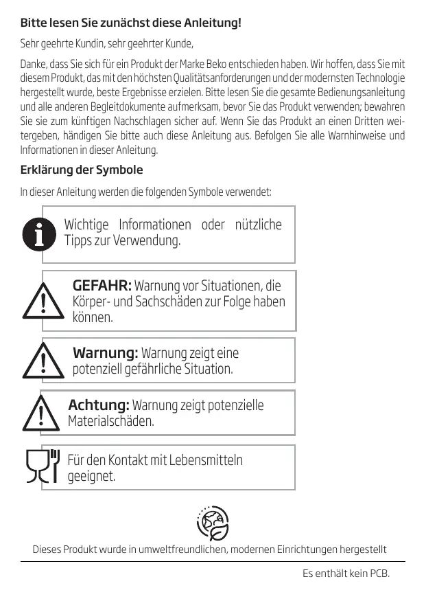 Sehr geehrter Kunde! Vielen Dank, dass Sie sich für ein Qualitätsprodukt von Beko entschieden haben! Unsere Geräte werden nach den neuesten technischen Erkenntnissen entwickelt, produziert und geprüft.