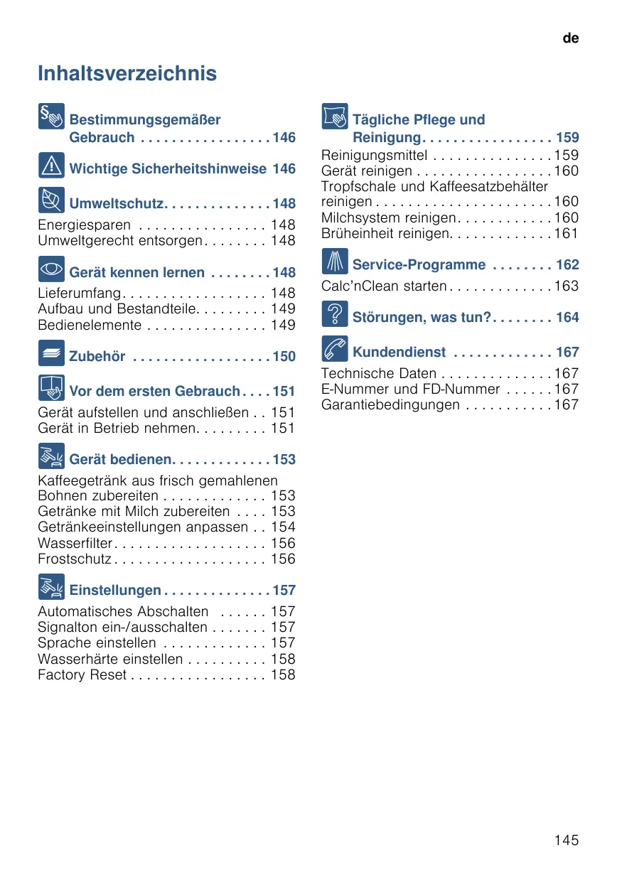 1 Einstellungen . . . . . . . . . . . . . . 157 Automatisches Abschalten Signalton ein-/ausschalten . Sprache einstellen . . . . . . . Wasserhärte einstellen . . . . Factory Reset . . . . . . . . . . .