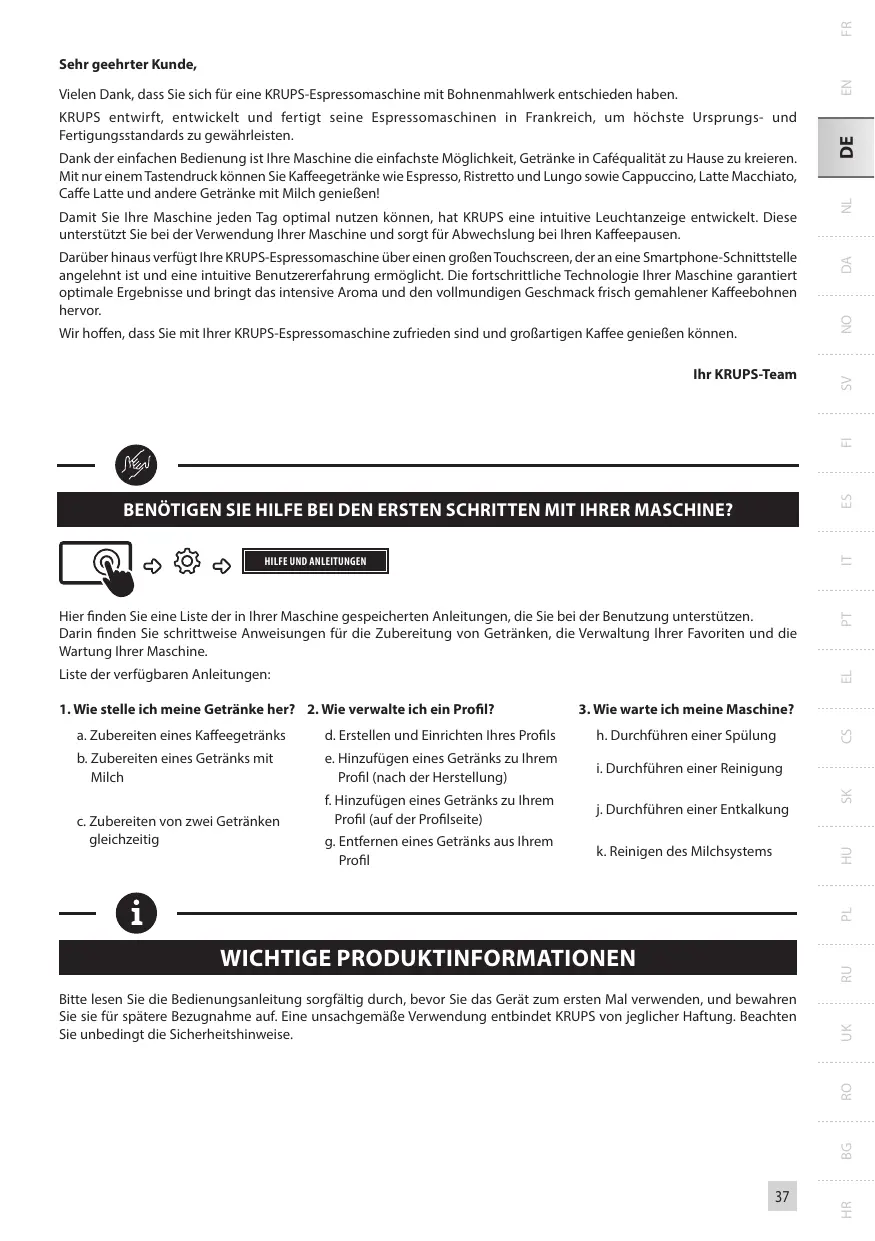 FR Darüber hinaus verfügt Ihre KRUPS-Espressomaschine über einen großen Touchscreen, der an eine Smartphone-Schnittstelle angelehnt ist und eine intuitive Benutzererfahrung ermöglicht. Die fortschrittliche Technologie Ihrer Maschine garantiert optimale Ergebnisse und bringt das intensive Aroma und den vollmundigen Geschmack frisch gemahlener Kaffeebohnen hervor. Wir hoffen, dass Sie mit Ihrer KRUPS-Espressomaschine zufrieden sind und großartigen Kaffee genießen können.