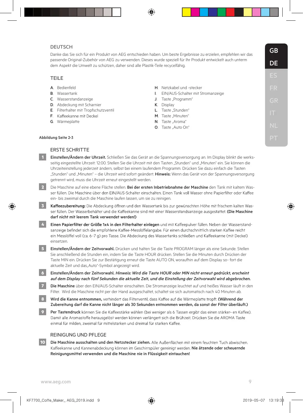 KF7700_Coffe_Maker_ AEG_2019.indd 8 www.aeg.com 2019-05-07 13:19:33 DEUTSCH Danke das Sie sich für ein Produkt von AEG entschieden haben. Um beste Ergebnisse zu erzielen, empfehlen wir das passende Original-Zubehör von AEG zu verwenden. Dieses wurde speziell für Ihr Produkt entwickelt auch unterm dem Aspekt die Umwelt zu schützen, daher sind alle Plastik-Teile recycelfähig. Bedienfeld Wassertank Wasserstandanzeige Abdeckung mit Scharnier Filterhalter mit Tropfschutzventil Wärmeplatte