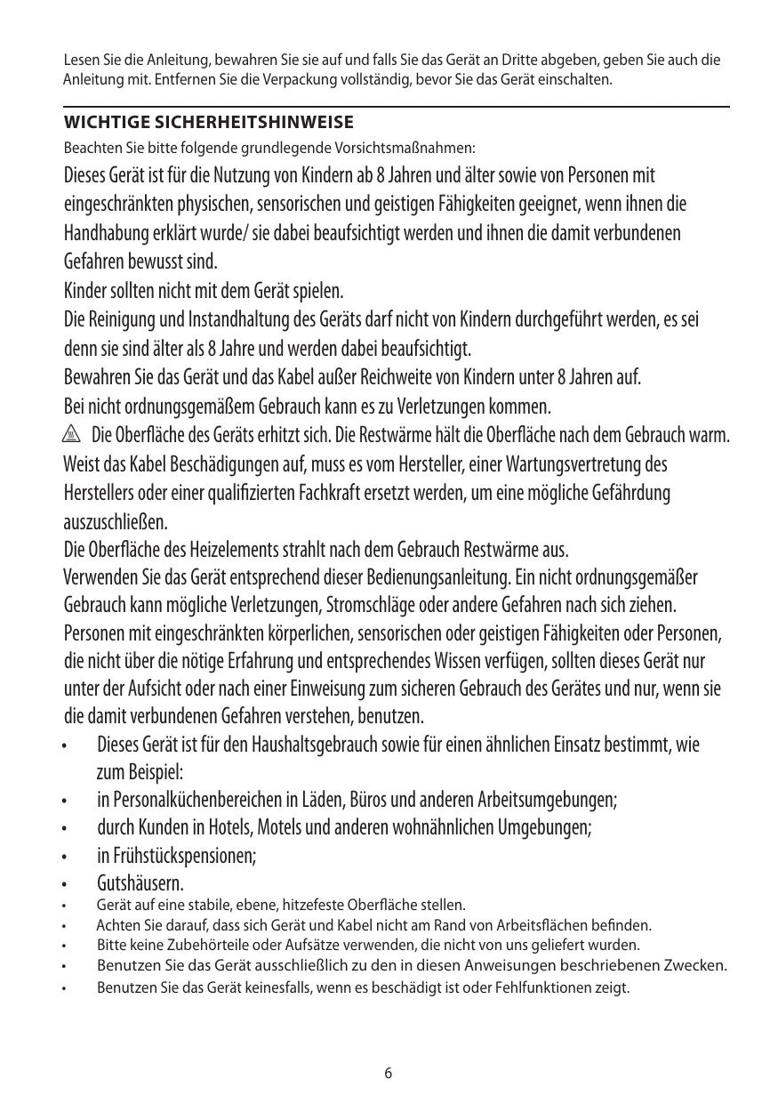 Dieses Gerät ist für die Nutzung von Kindern ab 8 Jahren und älter sowie von Personen mit eingeschränkten physischen, sensorischen und geistigen Fähigkeiten geeignet, wenn ihnen die Handhabung erklärt wurde/ sie dabei beaufsichtigt werden und ihnen die damit verbundenen Gefahren bewusst sind. Kinder sollten nicht mit dem Gerät spielen. Die Reinigung und Instandhaltung des Geräts darf nicht von Kindern durchgeführt werden, es sei denn sie sind älter als 8 Jahre und werden dabei beaufsichtigt. Bewahren Sie das Gerät und das Kabel außer Reichweite von Kindern unter 8 Jahren auf. Bei nicht ordnungsgemäßem Gebrauch kann es zu Verletzungen kommen. h Die Oberfläche des Geräts erhitzt sich. Die Restwärme hält die Oberfläche nach dem Gebrauch warm. Weist das Kabel Beschädigungen auf, muss es vom Hersteller, einer Wartungsvertretung des Herstellers oder einer qualifizierten Fachkraft ersetzt werden, um eine mögliche Gefährdung auszuschließen. Die Oberfläche des Heizelements strahlt nach dem Gebrauch Restwärme aus. Verwenden Sie das Gerät entsprechend dieser Bedienungsanleitung. Ein nicht ordnungsgemäßer Gebrauch kann mögliche Verletzungen, Stromschläge oder andere Gefahren nach sich ziehen. Personen mit eingeschränkten körperlichen, sensorischen oder geistigen Fähigkeiten oder Personen, die nicht über die nötige Erfahrung und entsprechendes Wissen verfügen, sollten dieses Gerät nur unter der Aufsicht oder nach einer Einweisung zum sicheren Gebrauch des Gerätes und nur, wenn sie die damit verbundenen Gefahren verstehen, benutzen. • Dieses Gerät ist für den Haushaltsgebrauch sowie für einen ähnlichen Einsatz bestimmt, wie zum Beispiel: • in Personalküchenbereichen in Läden, Büros und anderen Arbeitsumgebungen; • durch Kunden in Hotels, Motels und anderen wohnähnlichen Umgebungen; • in Frühstückspensionen; • Gutshäusern. • • • • •