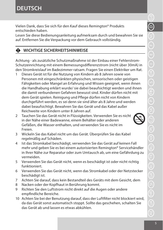 Achtung - als zusätzliche Schutzmaßnahme ist der Einbau einer FehlerstromSchutzeinrichtung mit einem Bemessungsdifferenzstrom (nicht über 30mA) in den Stromkreislauf im Badezimmer ratsam. Fragen Sie einen Elektriker um Rat. 1 Dieses Gerät ist für die Nutzung von Kindern ab 8 Jahren sowie von Personen mit eingeschränkten physischen, sensorischen oder geistigen Fähigkeiten oder Mangel an Erfahrung und Wissen geeignet, wenn ihnen die Handhabung erklärt wurde/ sie dabei beaufsichtigt werden und ihnen die damit verbundenen Gefahren bewusst sind. Kinder dürfen nicht mit dem Gerät spielen. Reinigung und Pflege dürfen nicht von Kindern durchgeführt werden, es sei denn sie sind älter als 8 Jahre und werden dabei beaufsichtigt. Bewahren Sie das Gerät und das Kabel außer Reichweite von Kindern unter 8 Jahren auf. 2 Tauchen Sie das Gerät nicht in Flüssigkeiten. Verwenden Sie es nicht in der Nähe einer Badewanne, einem Behälter oder anderen Gefäßen, die Wasser enthalten, und verwenden Sie es nicht im Freien. 3 Wickeln Sie das Kabel nicht um das Gerät. Überprüfen Sie das Kabel regelmäßig auf Schäden. 4 Ist das Stromkabel beschädigt, verwenden Sie das Gerät auf keinen Fall mehr und geben Sie es bei einem autorisierten Remington® Servicehändler in Ihrer Nähe zur Reparatur oder zum Umtausch ab, um eine Gefährdung zu vermeiden. 5 Verwenden Sie das Gerät nicht, wenn es beschädigt ist oder nicht richtig funktioniert. 6 Verwenden Sie das Gerät nicht, wenn das Stromkabel oder der Netzstecker beschädigt ist. 7 Achten Sie darauf, dass kein Bestandteil des Geräts mit dem Gesicht, dem 8 Nacken oder der Kopfhaut in Berührung kommt. 9 Richten Sie den Luftstrom nicht direkt auf die Augen oder andere empfindliche Bereiche. 10 Achten Sie bei der Benutzung darauf, dass der Luftfilter nicht blockiert wird, da das Gerät sonst automatisch stoppt. Sollte das geschehen, schalten Sie das Gerät ab und lassen es etwas abkühlen.