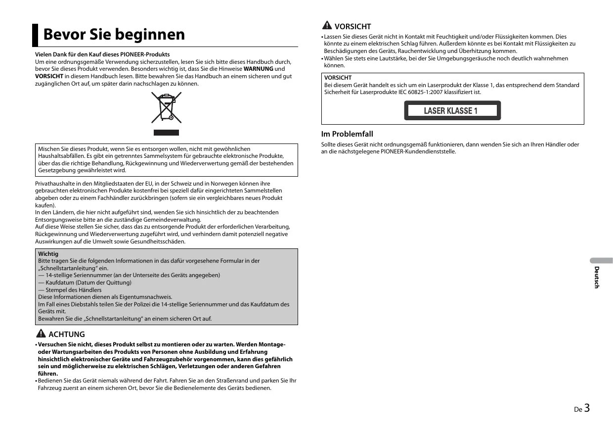 • Ne laissez pas cet appareil entrer en contact avec de l’humidité et/ou des liquides. Cela pourrait provoquer une décharge électrique. Tout contact avec des liquides pourrait également provoquer des dommages, de la fumée et une surchauffe de l’appareil. • Maintenez le niveau d’écoute à une valeur telle que vous puissiez entendre les sons provenant de l’extérieur. • Le Pioneer CarStereo-Pass est utilisable seulement en Allemagne.