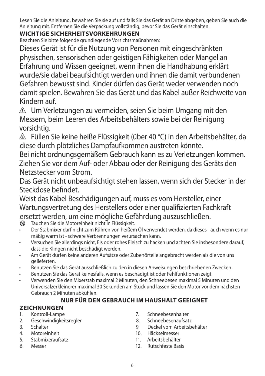 • N’essayez pas de piler de la glace ou de hacher de la viande crue et faites attention aux lames. N’adaptez pas d’accessoires autres que ceux fournis. N’utilisez pas l’appareil à d’autres fins que celles décrites dans ce mode d’emploi. N’utilisez pas l’appareil s’il est endommagé ou s’il ne fonctionne pas correctement. Ne pas utiliser le batteur pendant plus de 2 minutes, le fouet pendant plus de 5 minutes, le hachoir pendant plus de 30 secondes. Laissez le moteur refroidir pendant 2 minutes avant d’utiliser à nouveau ces accessoires.