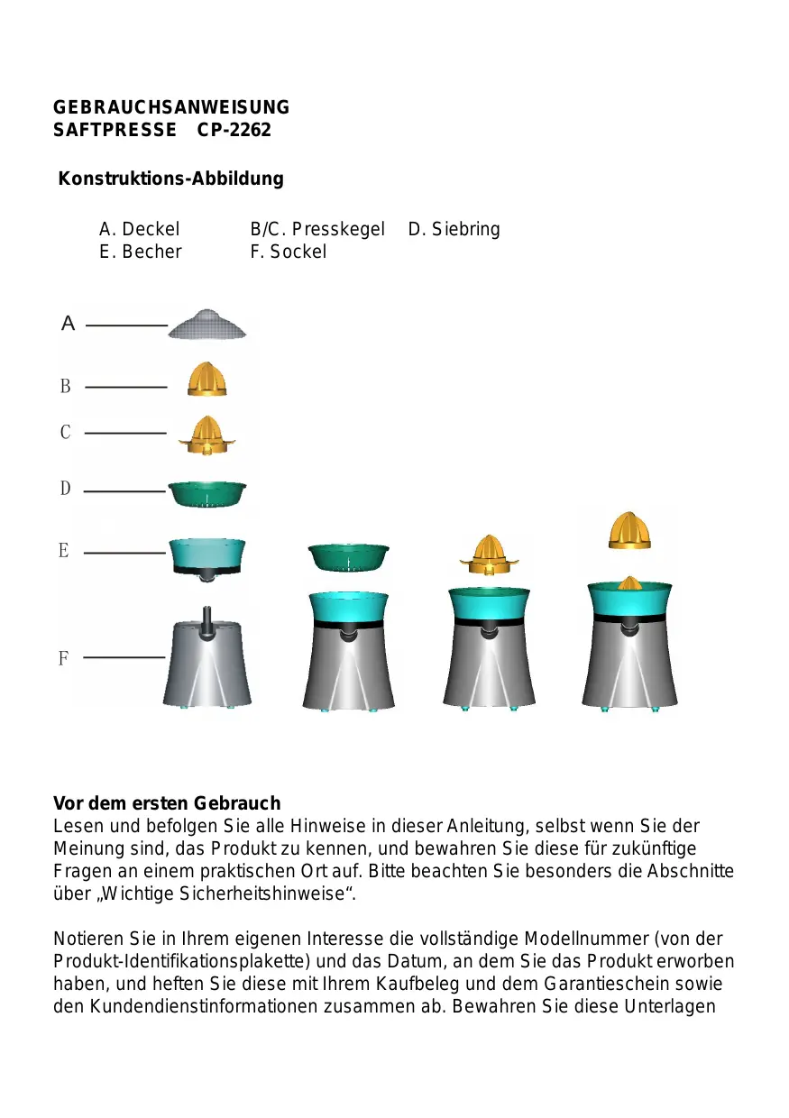 GEBRAUCHSANWEISUNG SAFTPRESE CP-2262