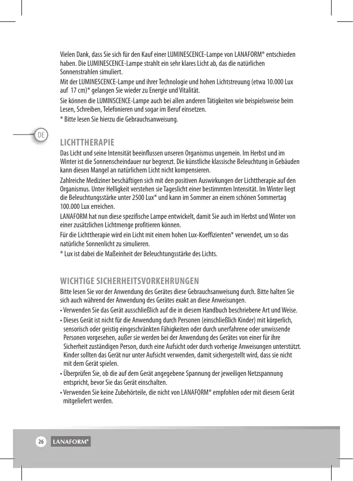 Vielen Dank, dass Sie sich für den Kauf einer LUMINESCENCE-Lampe von LANAFORM® entschieden haben. Die LUMINESCENCE-Lampe strahlt ein sehr klares Licht ab, das die natürlichen Sonnenstrahlen simuliert. Mit der LUMINESCENCE-Lampe und ihrer Technologie und hohen Lichtstreuung (etwa 10.000 Lux auf 17 cm)* gelangen Sie wieder zu Energie und Vitalität. Sie können die LUMINSCENCE-Lampe auch bei allen anderen Tätigkeiten wie beispielsweise beim Lesen, Schreiben, Telefonieren und sogar im Beruf einsetzen. * Bitte lesen Sie hierzu die Gebrauchsanweisung.