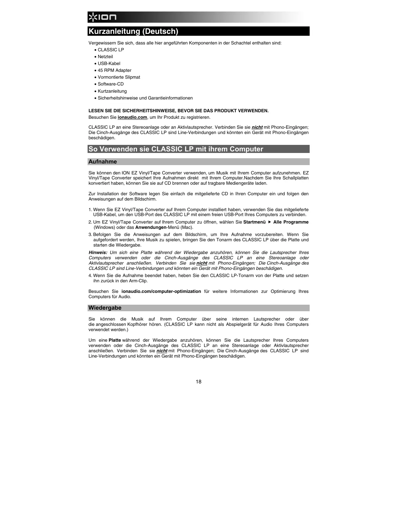 • Sicherheitshinweise und Garantieinformationen LESEN SIE DIE SICHERHEITSHINWEISE, BEVOR SIE DAS PRODUKT VERWENDEN. Besuchen Sie ionaudio.com, um Ihr Produkt zu registrieren. CLASSIC LP an eine Stereoanlage oder an Aktivlautsprecher. Verbinden Sie sie nicht mit Phono-Eingängen; Die Cinch-Ausgänge des CLASSIC LP sind Line-Verbindungen und könnten ein Gerät mit Phono-Eingängen beschädigen. So Verwenden sie CLASSIC LP mit ihrem Computer Aufnahme Sie können den ION EZ Vinyl/Tape Converter verwenden, um Musik mit Ihrem Computer aufzunehmen. EZ Vinyl/Tape Converter speichert Ihre Aufnahmen direkt mit Ihrem Computer.Nachdem Sie Ihre Schallplatten konvertiert haben, können Sie sie auf CD brennen oder auf tragbare Mediengeräte laden. Zur Installation der Software legen Sie einfach die mitgelieferte CD in Ihren Computer ein und folgen den Anweisungen auf dem Bildschirm.