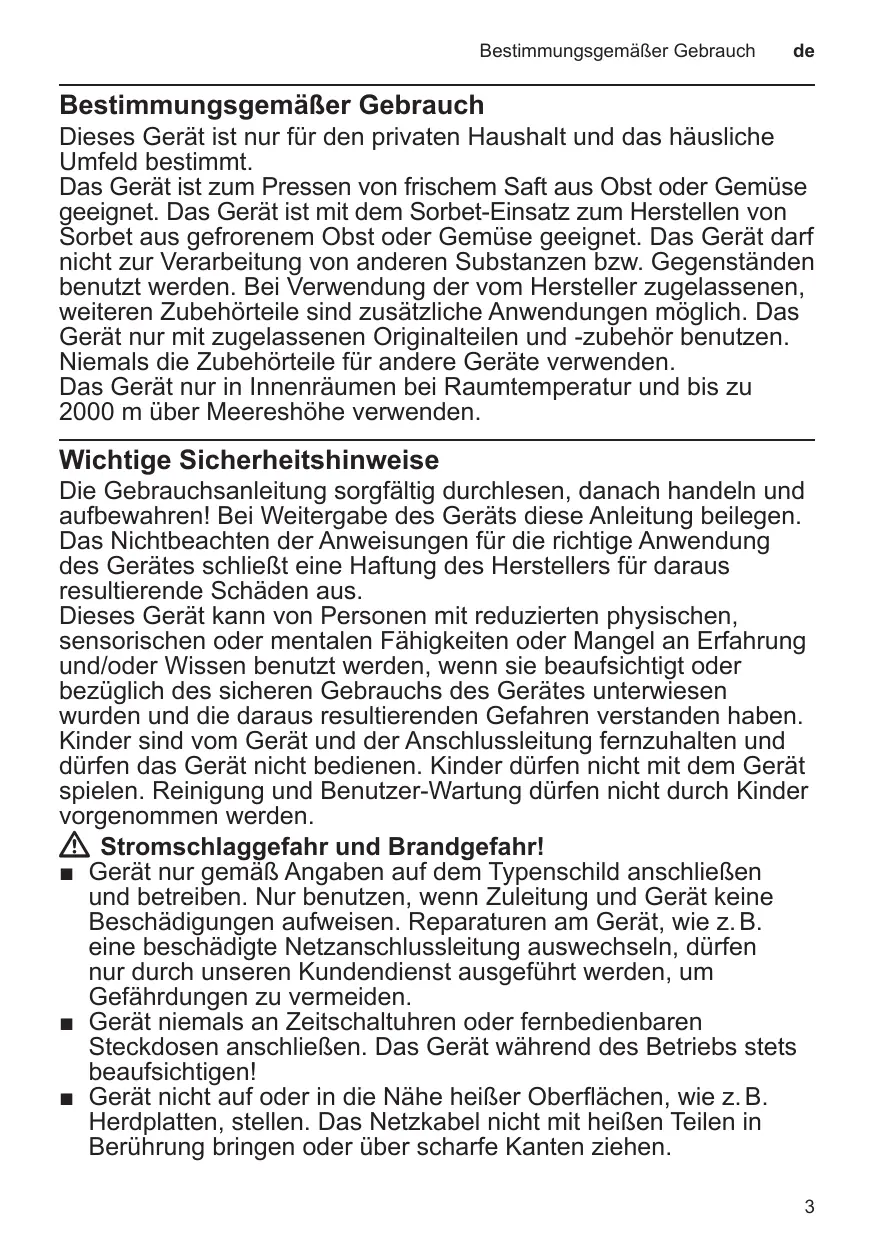 8. Wenn die Verarbeitung beendet oder der Saftbehälter voll ist, den Schalter auf O stellen und den Stillstand des Für dieses Gerät gelten die von unserer jeweils zuständigen Landesvertretung herausgegebenen Garantiebedingungen des Landes, in dem das Gerät gekauft wurde. Sie können die Garantiebedingungen jederzeit über Ihren Fachhändler, bei dem Sie das Gerät gekauft haben, oder direkt bei unserer Landesvertretung anfordern. Die Garantiebedingungen für Ne jamais utiliser les accessoires destinés à d’autres appareils. N’utiliser l’appareil que dans des pièces intérieures à température ambiante et jusqu’à 2 000 m au-dessus du niveau de la mer.