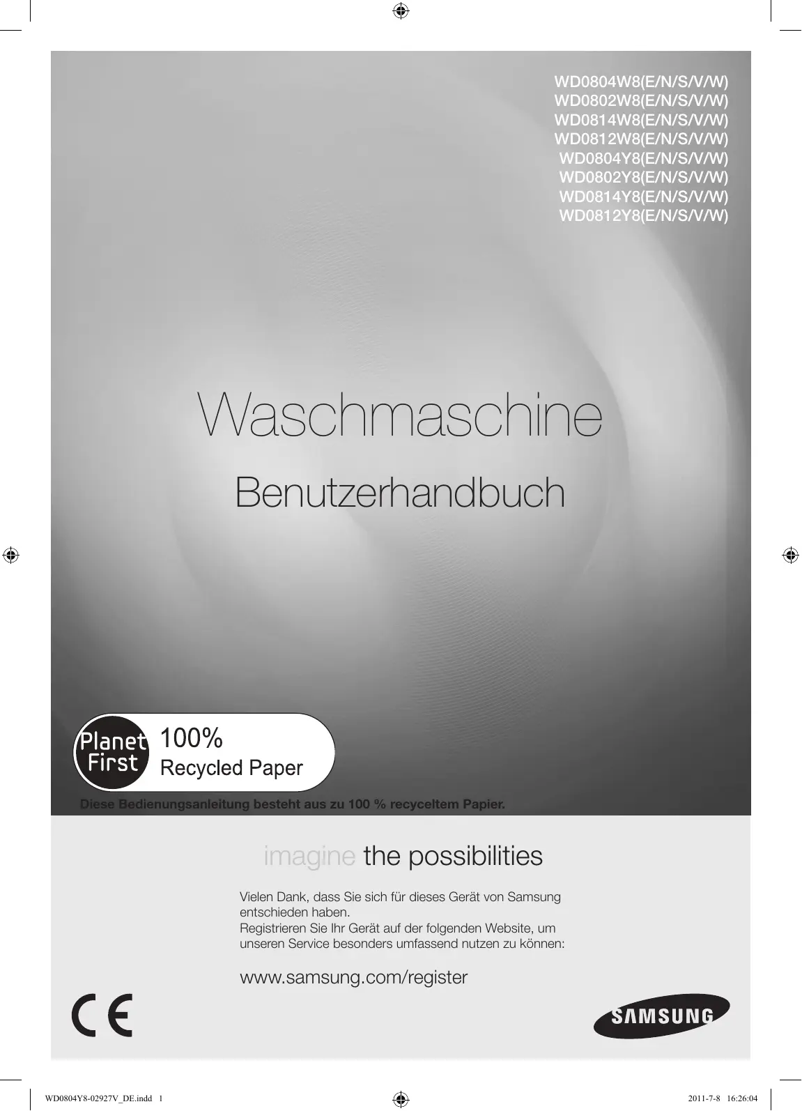 WD0804W8(E/N/S/V/W) WD0802W8(E/N/S/V/W) WD0814W8(E/N/S/V/W) WD0812W8(E/N/S/V/W) WD0804Y8(E/N/S/V/W) WD0802Y8(E/N/S/V/W) WD0814Y8(E/N/S/V/W) WD0812Y8(E/N/S/V/W) Waschmaschine Benutzerhandbuch Diese Bedienungsanleitung besteht aus zu 100 % recyceltem Papier. imagine the possibilities Vielen Dank, dass Sie sich für dieses Gerät von Samsung entschieden haben. Registrieren Sie Ihr Gerät auf der folgenden Website, um unseren Service besonders umfassend nutzen zu können: www.samsung.com/register WD0804Y8-02927V_DE.indd 1 2011-7-8 16:26:04 Funktionen Ihrer neuen Waschmaschine Mit dieser neuen Maschine macht Wäsche waschen richtig Spaß. Abgesehen von der speziellen Sprudlerfunkrion und der hohen Energieeffizienz verfügt Ihre neue Samsung-Waschmaschine über alle Vorteile, die das Waschen der Wäsche so einfach und angenehm wir nur möglich machen.