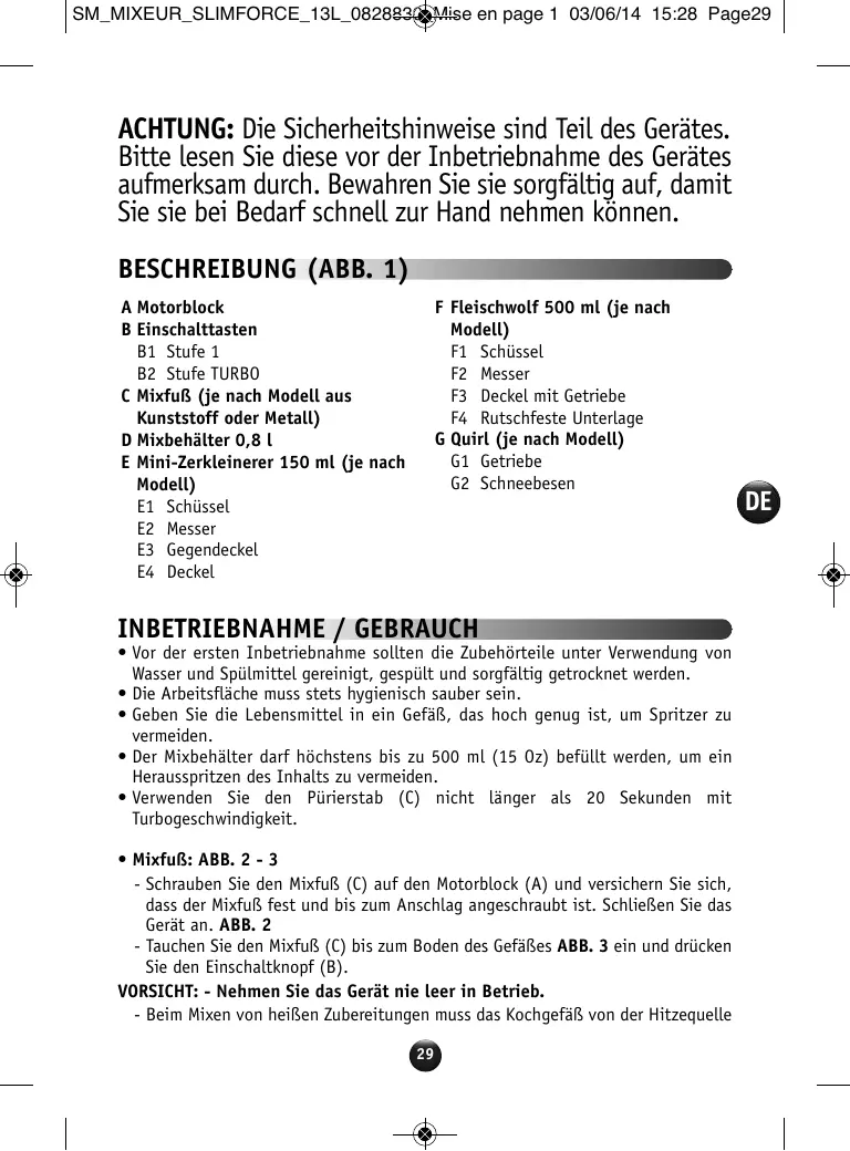 Laden Sie die Anleitung für Ihr Stabmixer kostenlos im PDF-Format! Finden Sie Ihr Handbuch HB853A38 SLIMFORCE - TEFAL und nehmen Sie Ihr elektronisches Gerät wieder in die Hand. Auf dieser Seite sind alle Dokumente veröffentlicht, die für die Verwendung Ihres Geräts notwendig sind. HB853A38 SLIMFORCE von der Marke TEFAL.