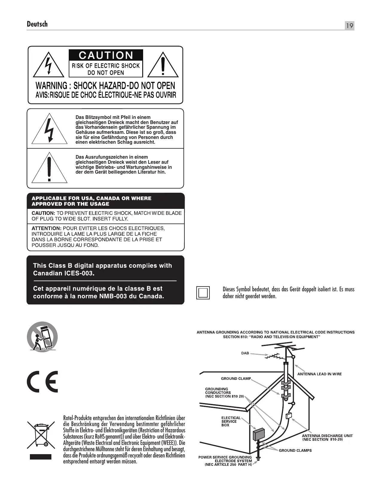 DAB Tous les appareils Rotel sont conçus en totale conformité avec les directives internationales concernant les restrictions d’utilisation de substances dangereuses (RoHS) pour l’environnement, dans les équipements électriques et électroniques, ainsi que pour le recyclage des matériaux utilisés (WEEE, pour Waste Electrical and Electronic Equipment). Le symbole du conteneur à ordures barré par une croix indique la compatibilité avec ces directives, et le fait que les appareils peuvent être correctement recyclés ou traités dans le respect total de ces normes.