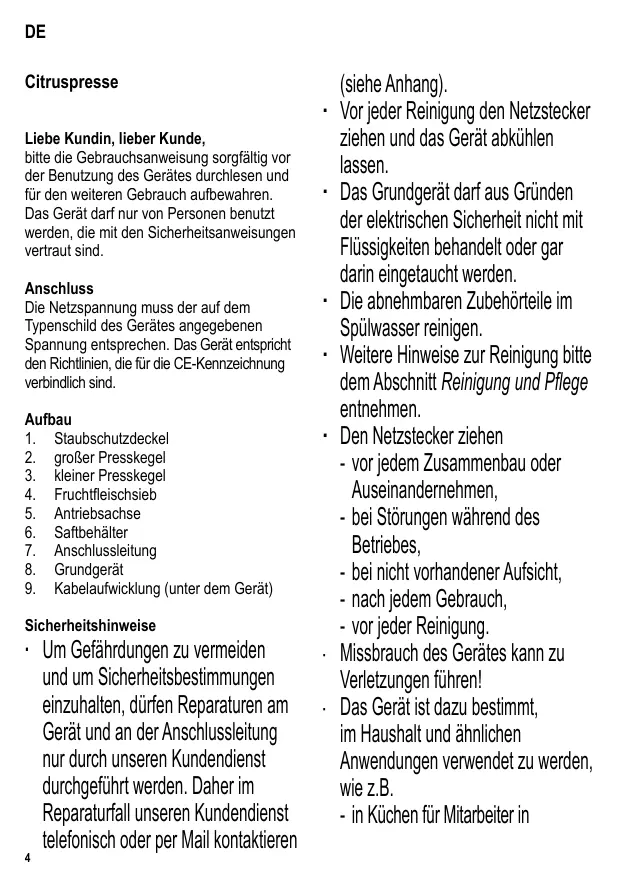 Citruspresse Liebe Kundin, lieber Kunde, bitte die Gebrauchsanweisung sorgfältig vor der Benutzung des Gerätes durchlesen und für den weiteren Gebrauch aufbewahren. Das Gerät darf nur von Personen benutzt werden, die mit den Sicherheitsanweisungen vertraut sind. Anschluss Die Netzspannung muss der auf dem Typenschild des Gerätes angegebenen Spannung entsprechen. Das Gerät entspricht den Richtlinien, die für die CE-Kennzeichnung verbindlich sind. Aufbau