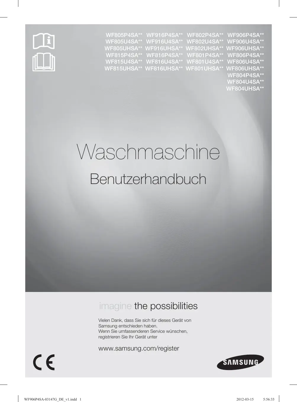www.samsung.com Code Nº DC68-03147G_FR WF906P4SA-03147G_FR_v2.indd 46 2012-03-27 6:48:22 WF805P4SA** WF805U4SA** WF805UHSA** WF815P4SA** WF815U4SA** WF815UHSA** WF916P4SA** WF916U4SA** WF916UHSA** WF816P4SA** WF816U4SA** WF816UHSA** WF802P4SA** WF802U4SA** WF802UHSA** WF801P4SA** WF801U4SA** WF801UHSA** WF906P4SA** WF906U4SA** WF906UHSA** WF806P4SA** WF806U4SA** WF806UHSA** WF804P4SA** WF804U4SA** WF804UHSA** Waschmaschine Benutzerhandbuch imagine the possibilities Vielen Dank, dass Sie sich für dieses Gerät von Samsung entschieden haben. Wenn Sie umfassenderen Service wünschen, registrieren Sie Ihr Gerät unter www.samsung.com/register WF906P4SA-03147G_DE_v1.indd 1 2012-03-15 5:56:33 Features Ihrer neuen Waschmaschine von Samsung Mit dieser neuen Maschine macht Wäsche waschen richtig Spaß. Abgesehen von der speziellen Sprudlerfunktion und der hohen Energieeffizienz verfügt Ihre neue SamsungWaschmaschine über alle Vorteile, die das Waschen der Wäsche so einfach und angenehm wir nur möglich machen.