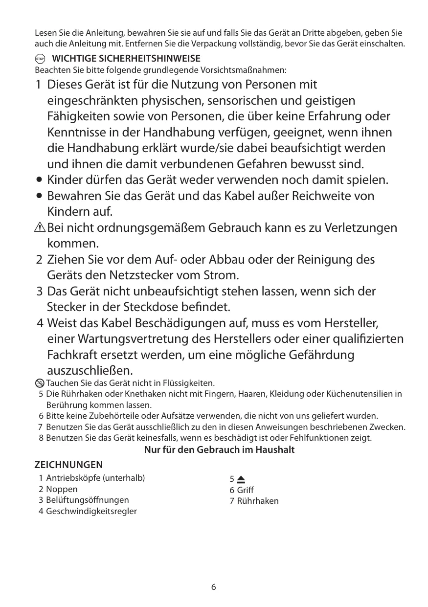 L Tauchen Sie das Gerät nicht in Flüssigkeiten. 5 Die Rührhaken oder Knethaken nicht mit Fingern, Haaren, Kleidung oder Küchenutensilien in Berührung kommen lassen. 6 Bitte keine Zubehörteile oder Aufsätze verwenden, die nicht von uns geliefert wurden. 7 Benutzen Sie das Gerät ausschließlich zu den in diesen Anweisungen beschriebenen Zwecken. 8 Benutzen Sie das Gerät keinesfalls, wenn es beschädigt ist oder Fehlfunktionen zeigt.
