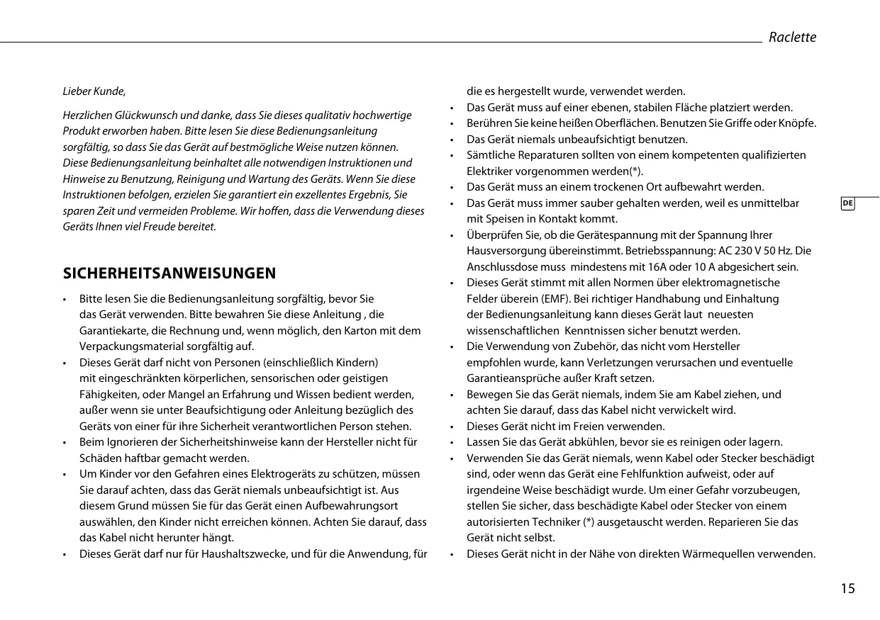 • Le fabricant ne sera pas tenu responsable de tous dommages si les consignes de sécurité ne sont pas respectées. Pour protéger les enfants des dangers des appareils électriques, veillez à ne jamais laisser les appareils sans surveillance. Par conséquent, il faudra choisir un lieu de rangement pour l’appareil inaccessible aux enfants. Veillez à ce que le cordon ne pende pas. Cet appareil est uniquement destiné à des utilisations domestiques et seulement dans le but pour lequel il est fabriqué. L’appareil doit être posé sur une surface stable et nivelée. Ne touchez pas les surfaces brûlantes. Utilisez les poignées ou les boutons.