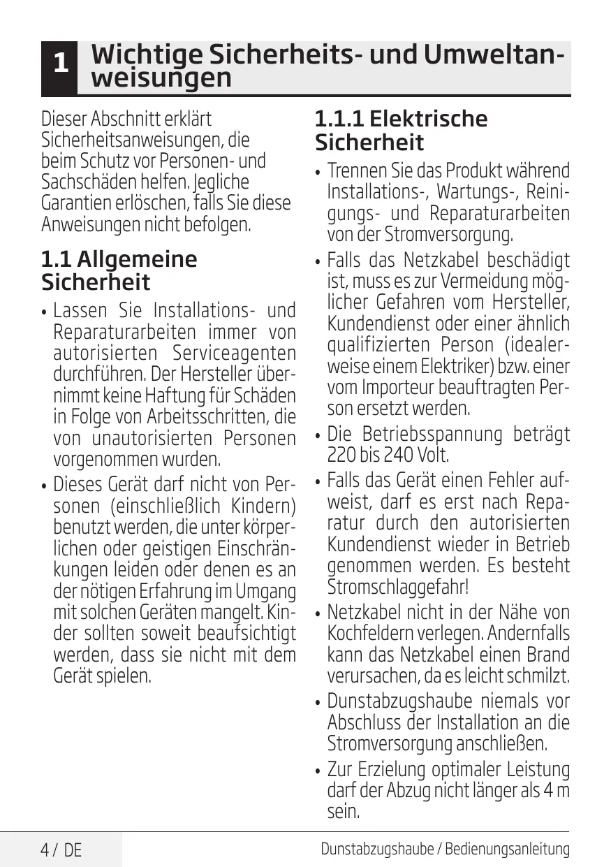 • Déconnectez l'appareil du secteur corporels ou de dégâts matériels. pendant les procédures d'installaToute garantie sera nulle en cas de tion, d'entretien, de nettoyage et non-respect de ces consignes. de réparation. • Si le câble d'alimentation est en1.1 Consignes dommagé, faites-le remplacer par générales de sécurité le fabricant, le service après-vente • Les procédures d'installation et de ou toute personne aux qualificaréparation doivent toujours être tions similaires (de préférence un mises en application par un agent électricien) ou encore une autre de service agréé. Le fabricant ne personne désignée par l'imporsaurait être tenu responsable des tateur afin d'éviter d'éventuels dommages découlant des prorisques. cédures effectuées par des per• La tension de fonctionnement est sonnes non autorisées. de 220 à 240 volts. • Ce produit n'a pas été prévu pour être utilisé par des personnes (no- • Si l'appareil est défectueux, il ne doit pas être utilisé à moins d'être tamment les enfants) dont les caréparé par un agent de service pacités physiques, sensorielles ou agréé. Il y a risque d'électrocution ! mentales sont réduites, ou n'ayant pas suffisamment d'expérience ou • Ne faites pas passer le câble électrique près des plaques. Autrede connaissances. • Les enfants ment, il pourrait fondre facilement doivent toujours être surveillés et causer un incendie. pour s'assurer qu'ils ne jouent pas avec l'appareil. • Ne branchez jamais la hotte avant la fin de l'installation. • Afin d'obtenir les meilleurs résultats, le conducteur externe ne doit pas être supérieur à 4 m.
