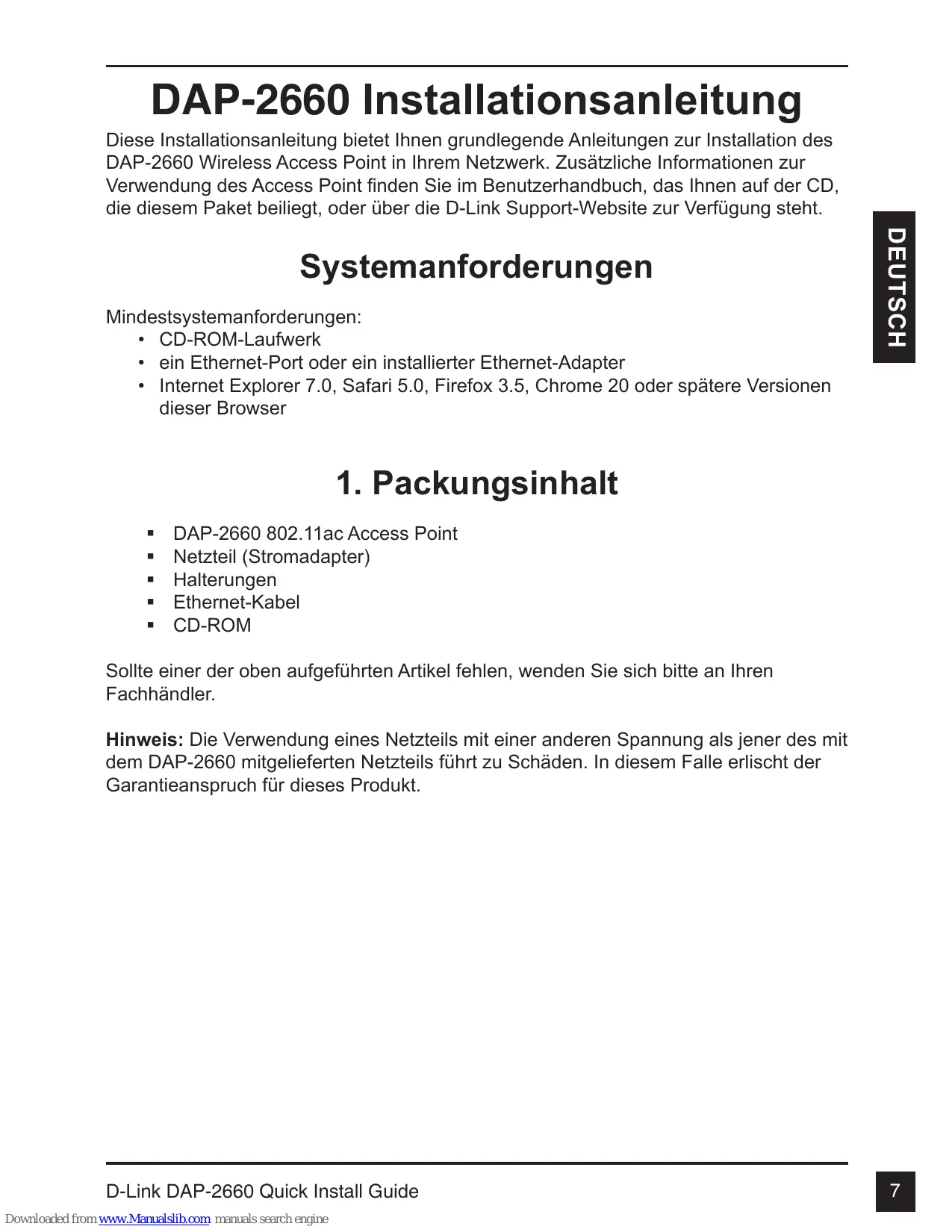 Downloaded from www.Manualslib.com manuals search engine D-Link DAP-2660 Quick Install Guide DAP-2660 Installationsanleitung Diese Installationsanleitung bietet Ihnen grundlegende Anleitungen zur Installation des DAP-2660 Wireless Access Point in Ihrem Netzwerk. Zusätzliche Informationen zur Verwendung des Access Point finden Sie im Benutzerhandbuch, das Ihnen auf der CD, die diesem Paket beiliegt, oder über die D-Link Support-Website zur Verfügung steht. Mindestsystemanforderungen:
