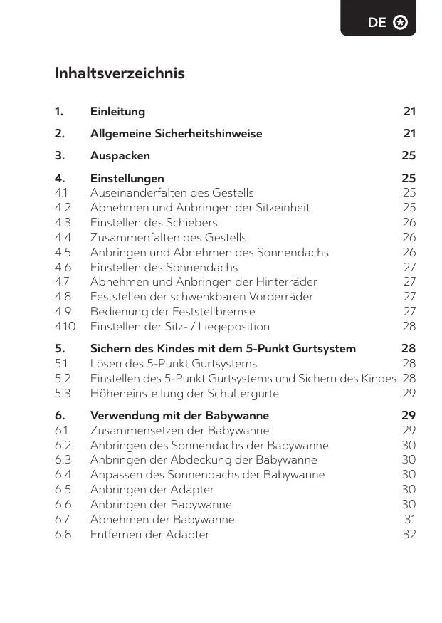 6.8 Removing the adapters The guarantee period commences on the day of purchase. Anbringen und Abnehmen des Sonnendachs Einstellen des Sonnendachs Abnehmen und Anbringen der Hinterräder Feststellen der schwenkbaren Vorderräder Bedienung der Feststellbremse 4. Vergewissern Sie sich, dass Ihr Kind beim Aufklappen und Zusammenklappen des Wagens außer Reichweite ist, um Verletzungen zu vermeiden. 11. Die zulässige Beladung des Korbes beträgt 3 kg. 12. Sämtliche zusätzliche am Schieber und / oder an der Rückenlehne und / oder an den Seiten des Wagens befestigte Lasten können die Standfestigkeit des Kinderwagens beeinträchtigen. Kunststoffverpackungen, bevor Sie mit der Montage des Kinderwagens beginnen. 19. Benutzen Sie den Kinderwagen niemals auf DE